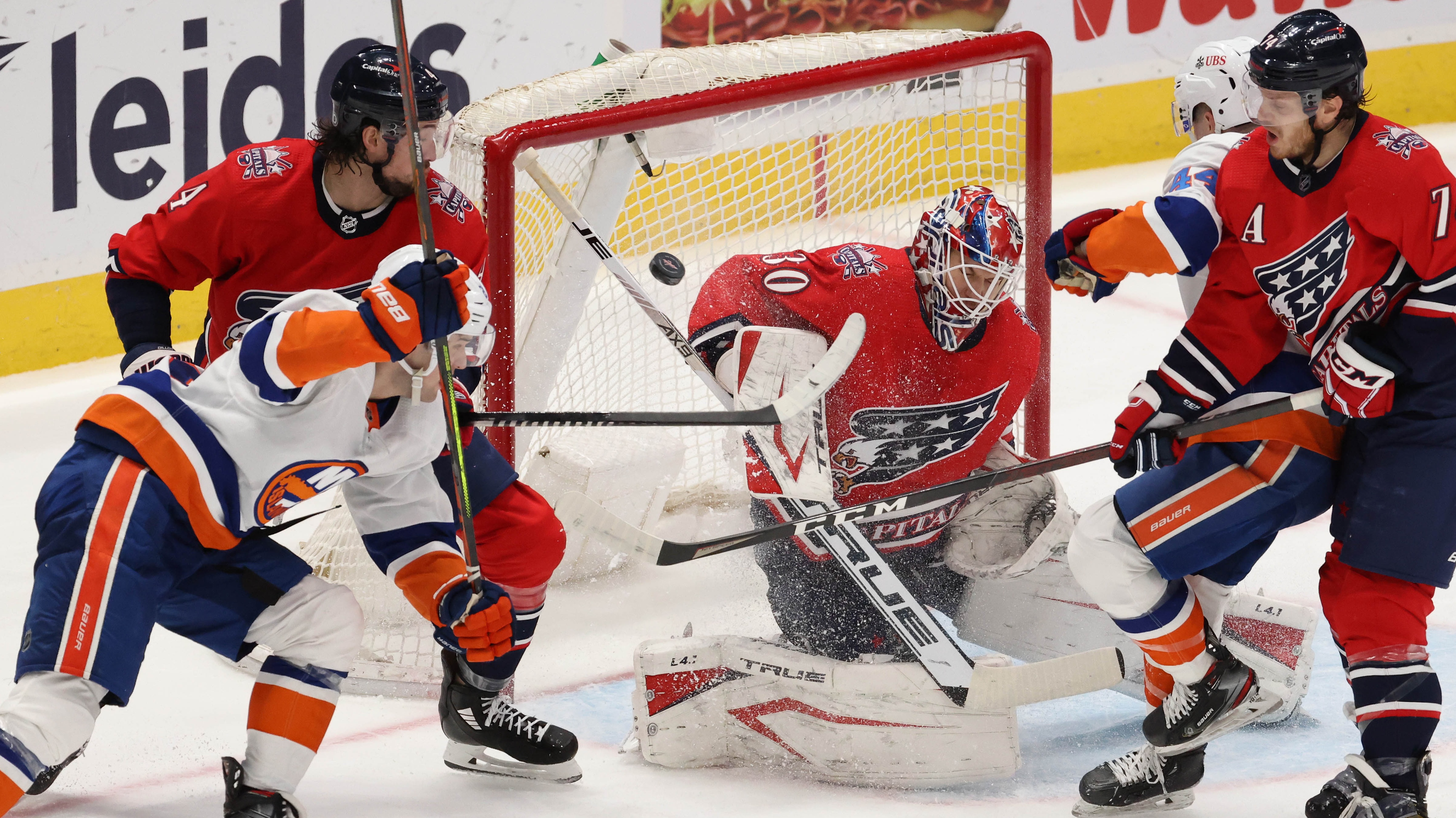 Capitals snap Islanders win streak with 3-1 victory Tuesday nightOvechkin takes sole possession of sixth on all-time goals scored list3/17/2021, 3:12 AMMar 16, 2021; Washington, District of Columbia, USA; Washington Capitals goaltender Ilya Samsonov (30) makes a save in front of New York Islanders right wing Oliver Wahlstrom (26) and Islanders center Jean-Gabriel Pageau (44) as Capitals defenseman Brenden Dillon (4) and Capitals defenseman John Carlson (74) defend in the second period at Capital One Arena. / © Geoff Burke-USA TODAY Sports