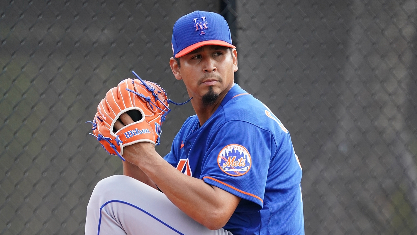 Carlos Carrasco winds up to pitch at 2021 Mets spring training. / Courtesy of New York Mets