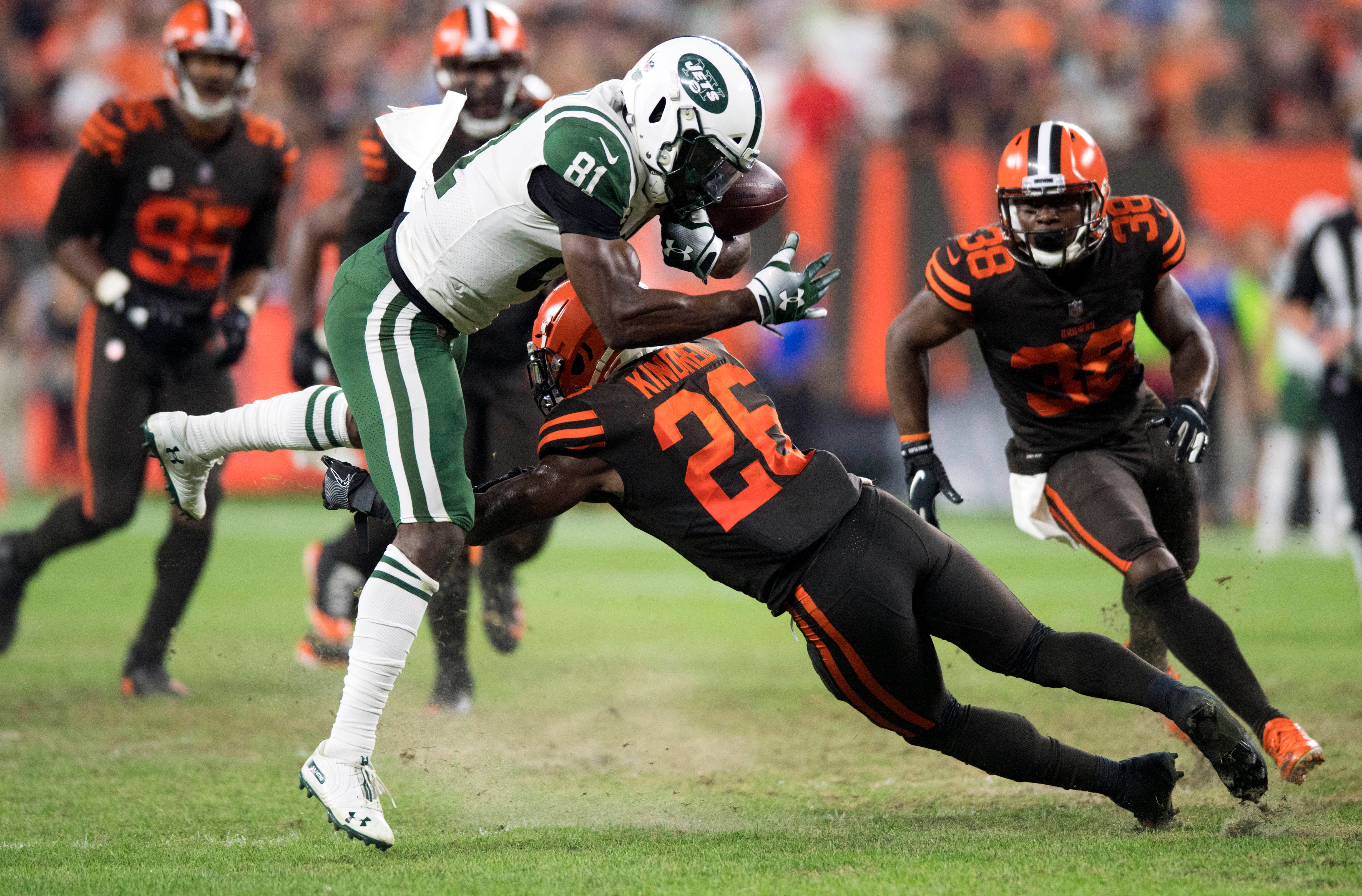 Sep 20, 2018; Cleveland, OH, USA; Cleveland Browns defensive back Derrick Kindred (26) tackles New York Jets wide receiver Quincy Enunwa (81) during the second half at FirstEnergy Stadium. Mandatory Credit: Ken Blaze-USA TODAY Sports / Ken Blaze