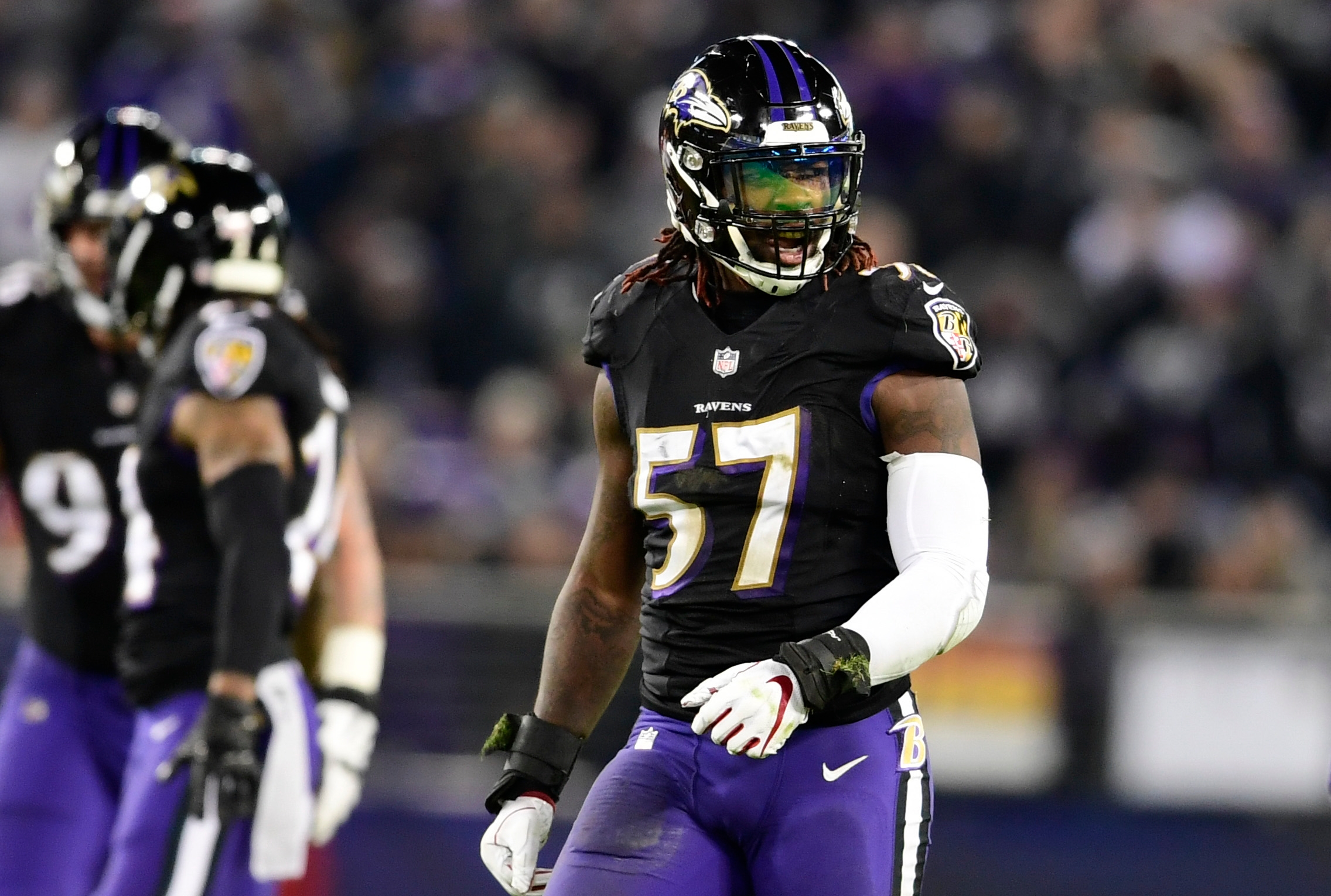 Dec 30, 2018; Baltimore, MD, USA; Baltimore Ravens inside linebacker C.J. Mosley (57) reacts after sacking Cleveland Browns quarterback Baker Mayfield (not pictured) during the second half at M&T Bank Stadium. Mandatory Credit: Tommy Gilligan-USA TODAY Sports / Tommy Gilligan