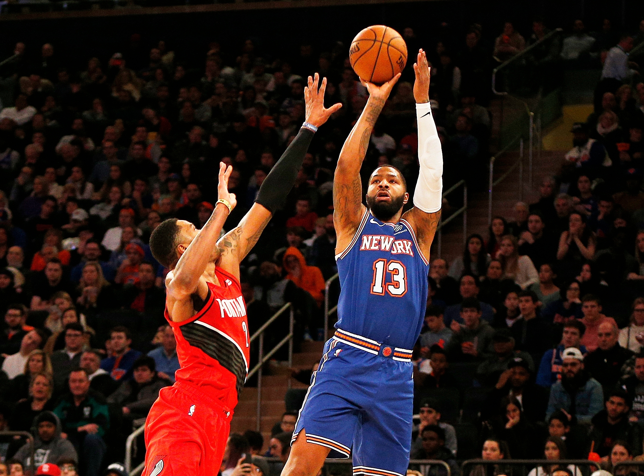 Jan 1, 2020; New York, New York, USA; New York Knicks forward Marcus Morris Sr. (13) takes a shot while being defended by Portland Trail Blazers guard Gary Trent Jr. (2) during the second half at Madison Square Garden. Mandatory Credit: Andy Marlin-USA TODAY Sportsundefined