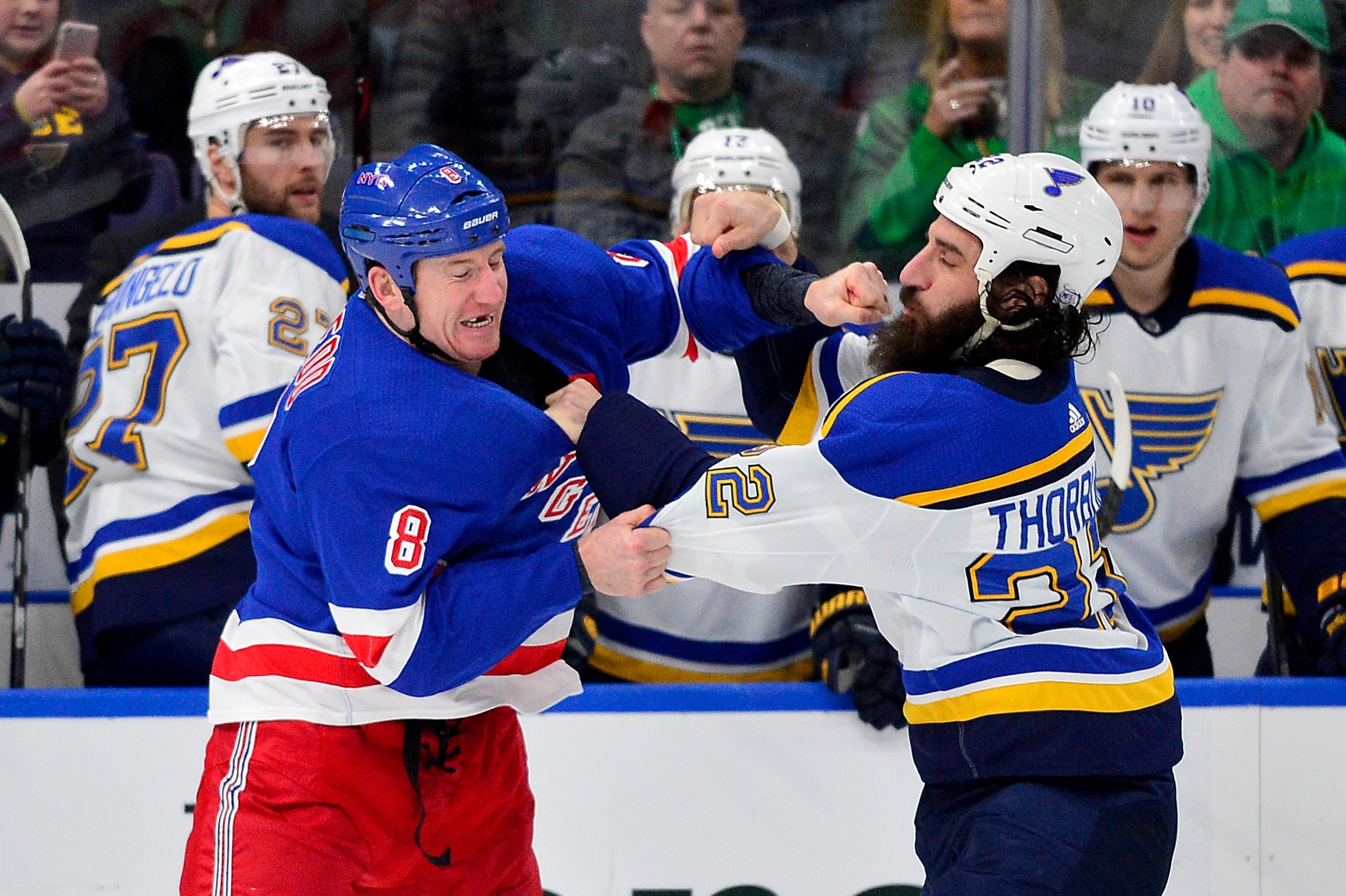 Mar 17, 2018; St. Louis, MO, USA; New York Rangers left wing Cody McLeod (8) and St. Louis Blues right wing Chris Thorburn (22) fight during the first period at Scottrade Center. Mandatory Credit: Jeff Curry-USA TODAY Sports / Jeff Curry