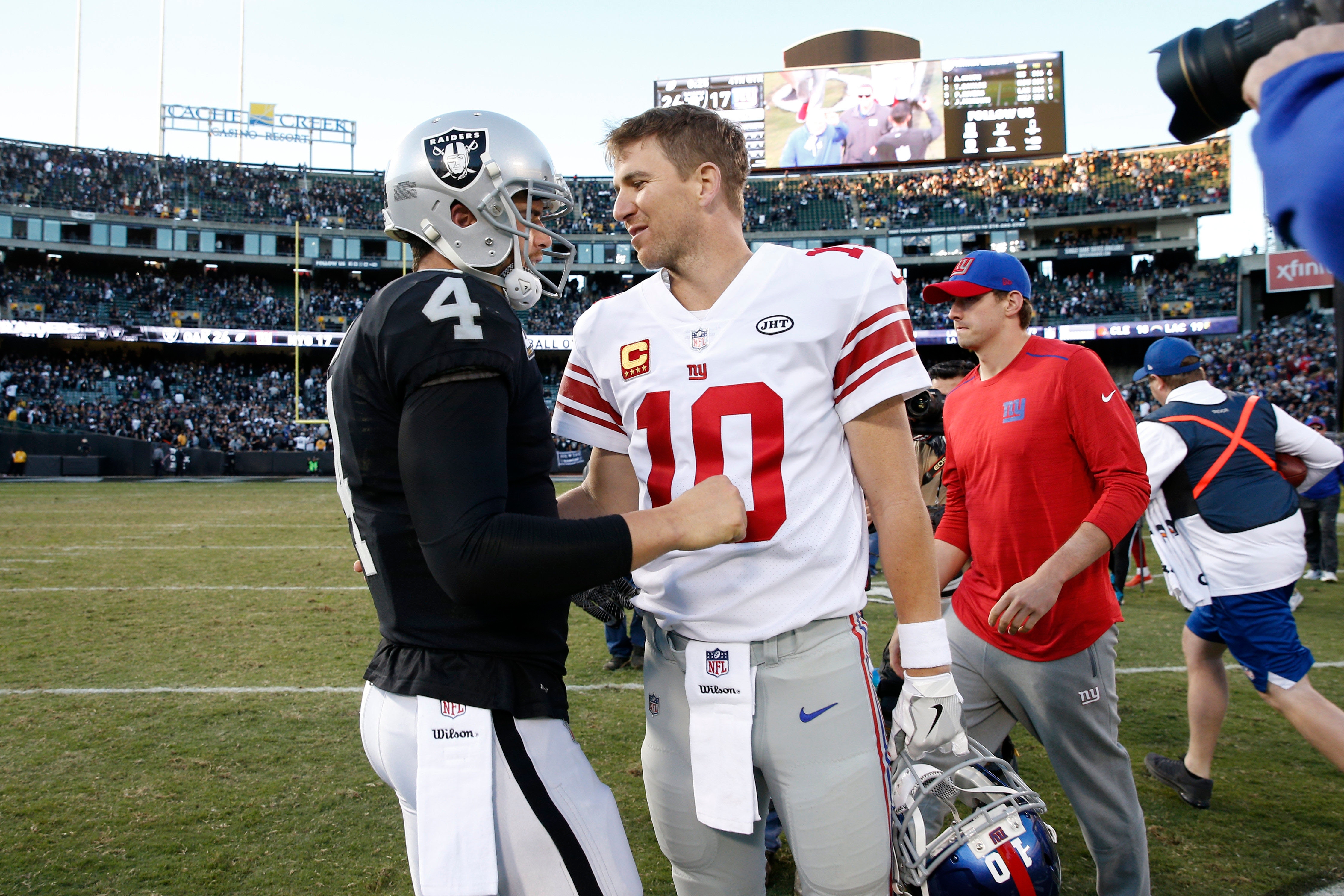 Dec 3, 2017; Oakland, CA, USA; New York Giants quarterback Eli Manning (10) is greeted by Oakland Raiders quarterback Derek Carr (4) after the game at Oakland Coliseum. Mandatory Credit: Cary Edmondson-USA TODAY Sports / Cary Edmondson