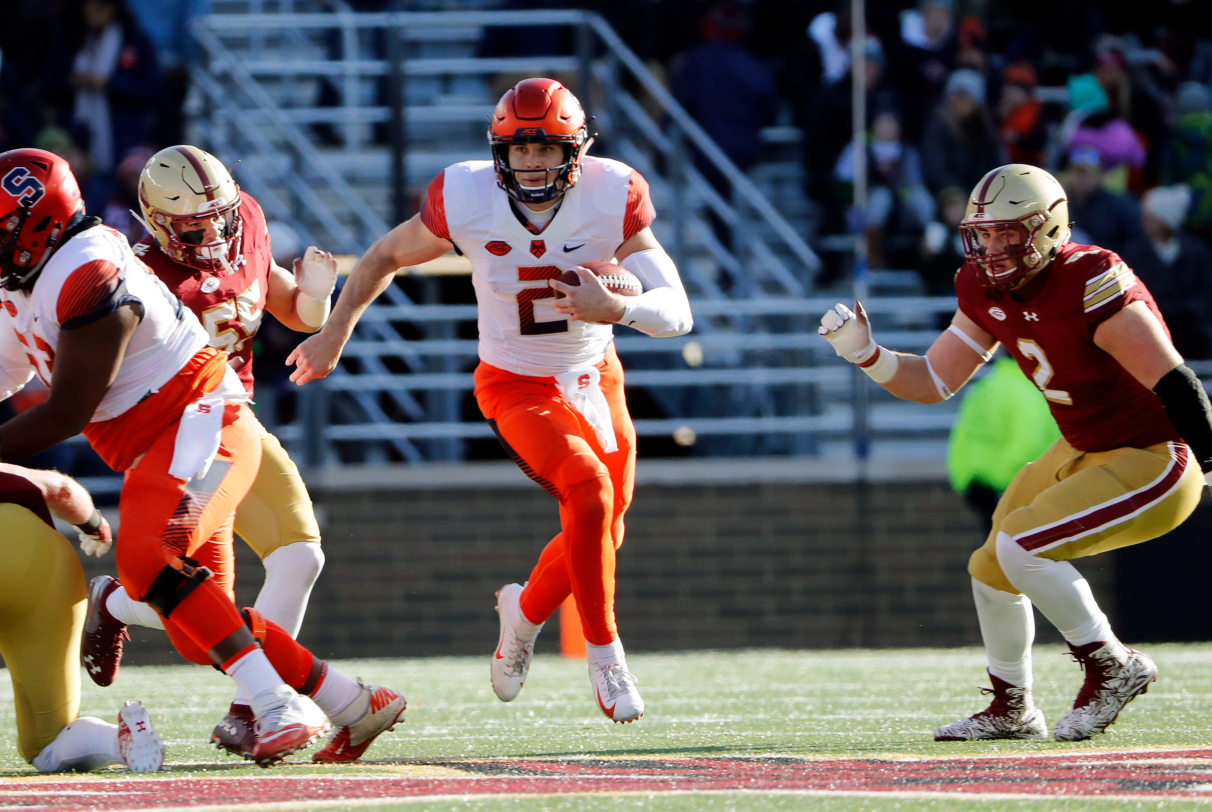 Nov 24, 2018; Chestnut Hill, MA, USA; Syracuse quarterback Eric Dungey (2) runs past Boston College defensive end Zach Allen (2) during the first half at Alumni Stadium. Mandatory Credit: Winslow Townson-USA TODAY Sports / Winslow Townson