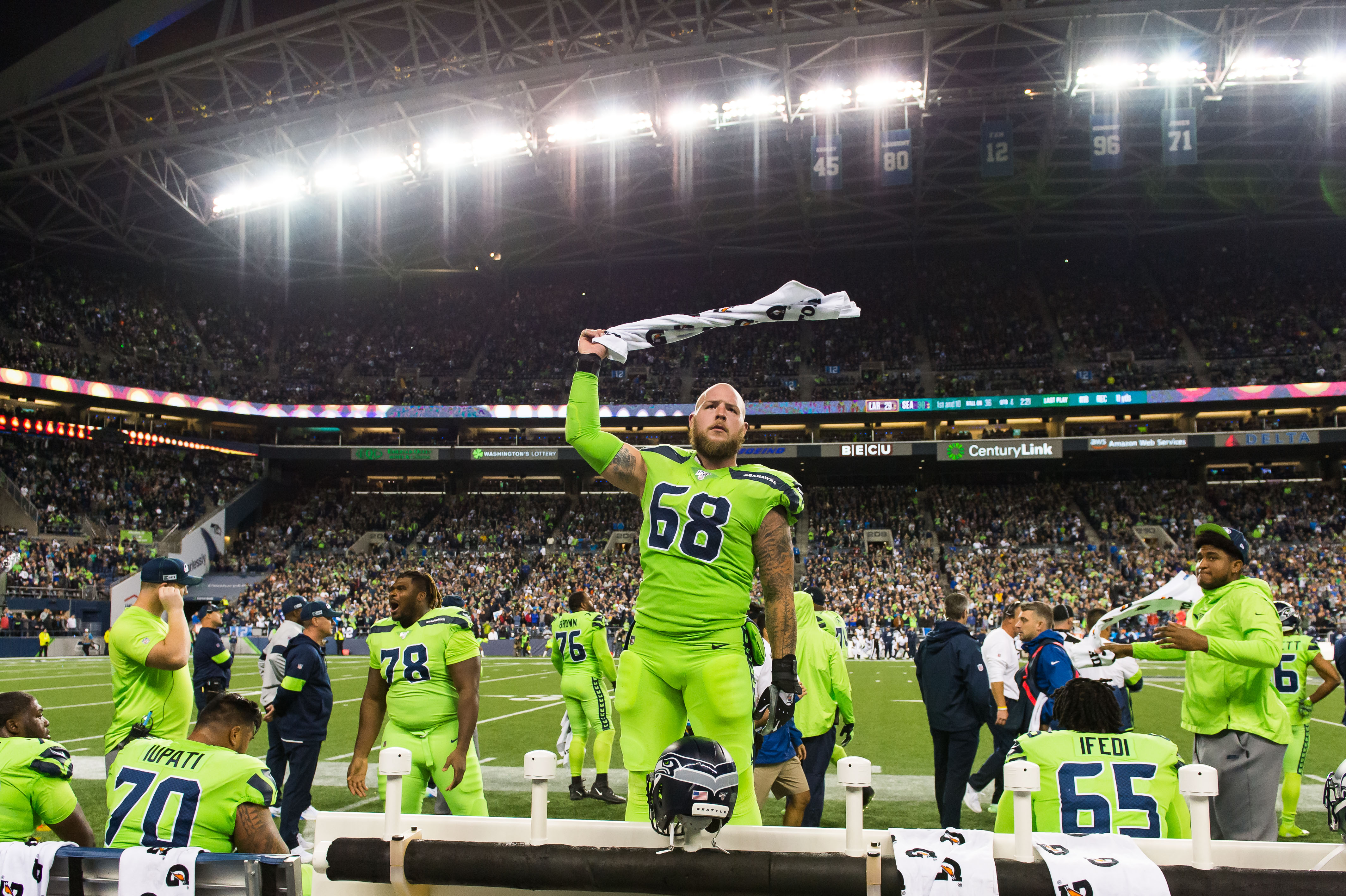Oct 3, 2019; Seattle, WA, USA; Seattle Seahawks center Justin Britt (68) interacts with the fans during the second half against the Los Angeles Rams at CenturyLink Field. Seattle defeated Los Angeles 30-29. Mandatory Credit: Steven Bisig-USA TODAY Sports / Steven Bisig