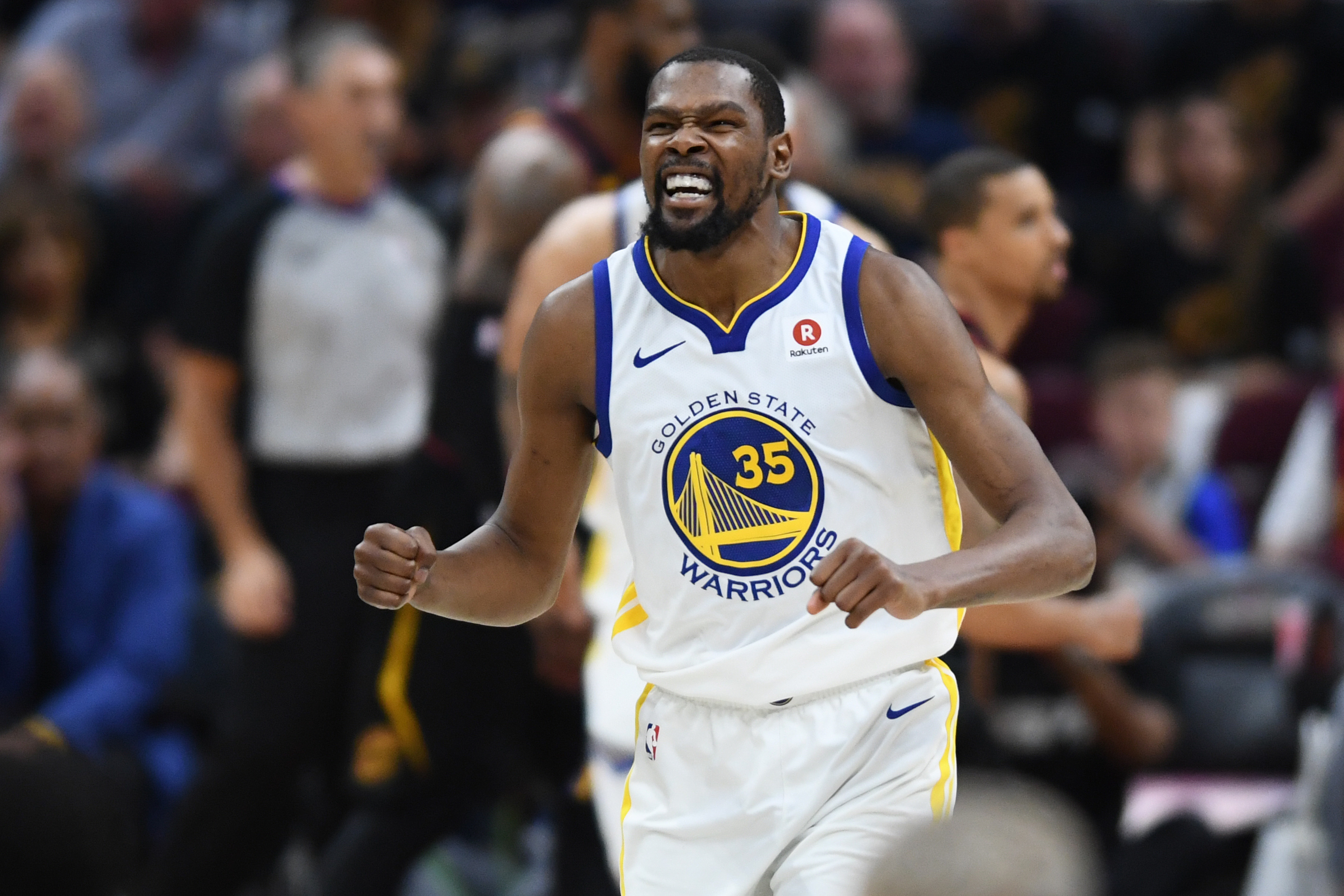 Jun 8, 2018; Cleveland, OH, USA; Golden State Warriors forward Kevin Durant (35) reacts in a timeout during the third quarter in game four of the 2018 NBA Finals against the Cleveland Cavaliers at Quicken Loans Arena. Mandatory Credit: Ken Blaze-USA TODAY Sports / Ken Blaze