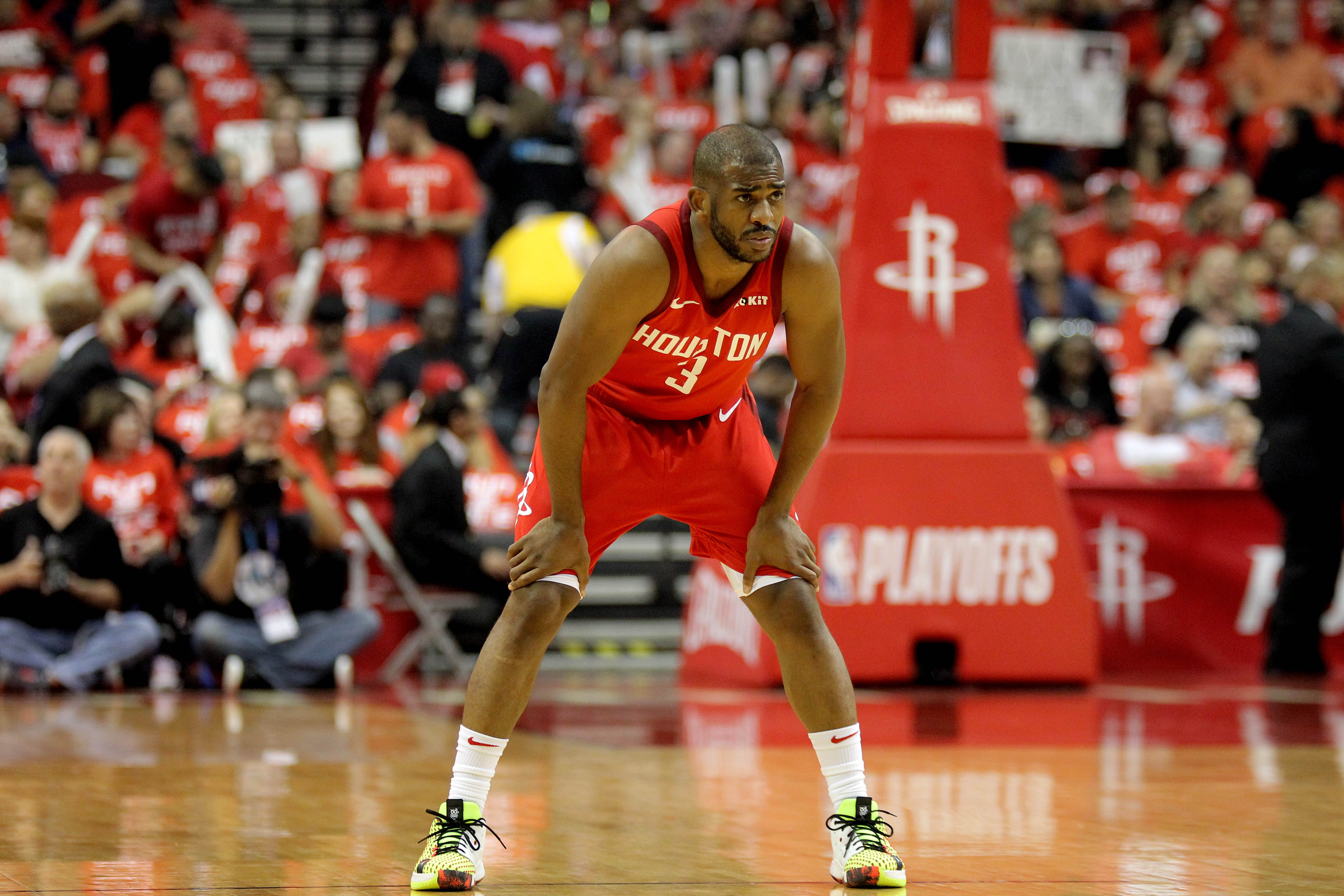 Apr 24, 2019; Houston, TX, USA; Houston Rockets guard Chris Paul (3) against the Utah Jazz in game five of the first round of the 2019 NBA Playoffs at Toyota Center. Mandatory Credit: Erik Williams-USA TODAY Sports / Erik Williams