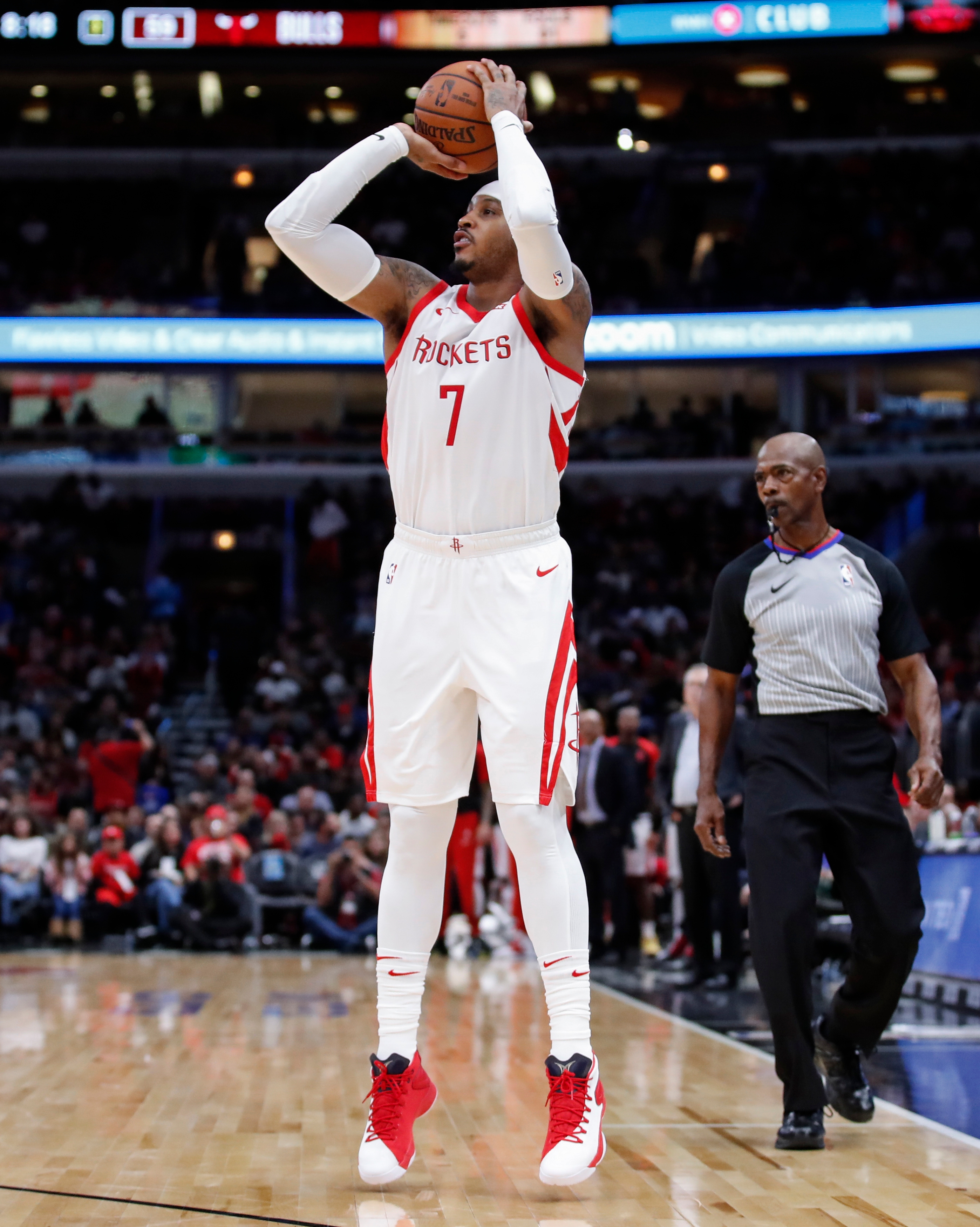 Nov 3, 2018; Chicago, IL, USA; Houston Rockets forward Carmelo Anthony (7) shoots against the Chicago Bulls during the second half at United Center. Mandatory Credit: Kamil Krzaczynski-USA TODAY Sports / Kamil Krzaczynski
