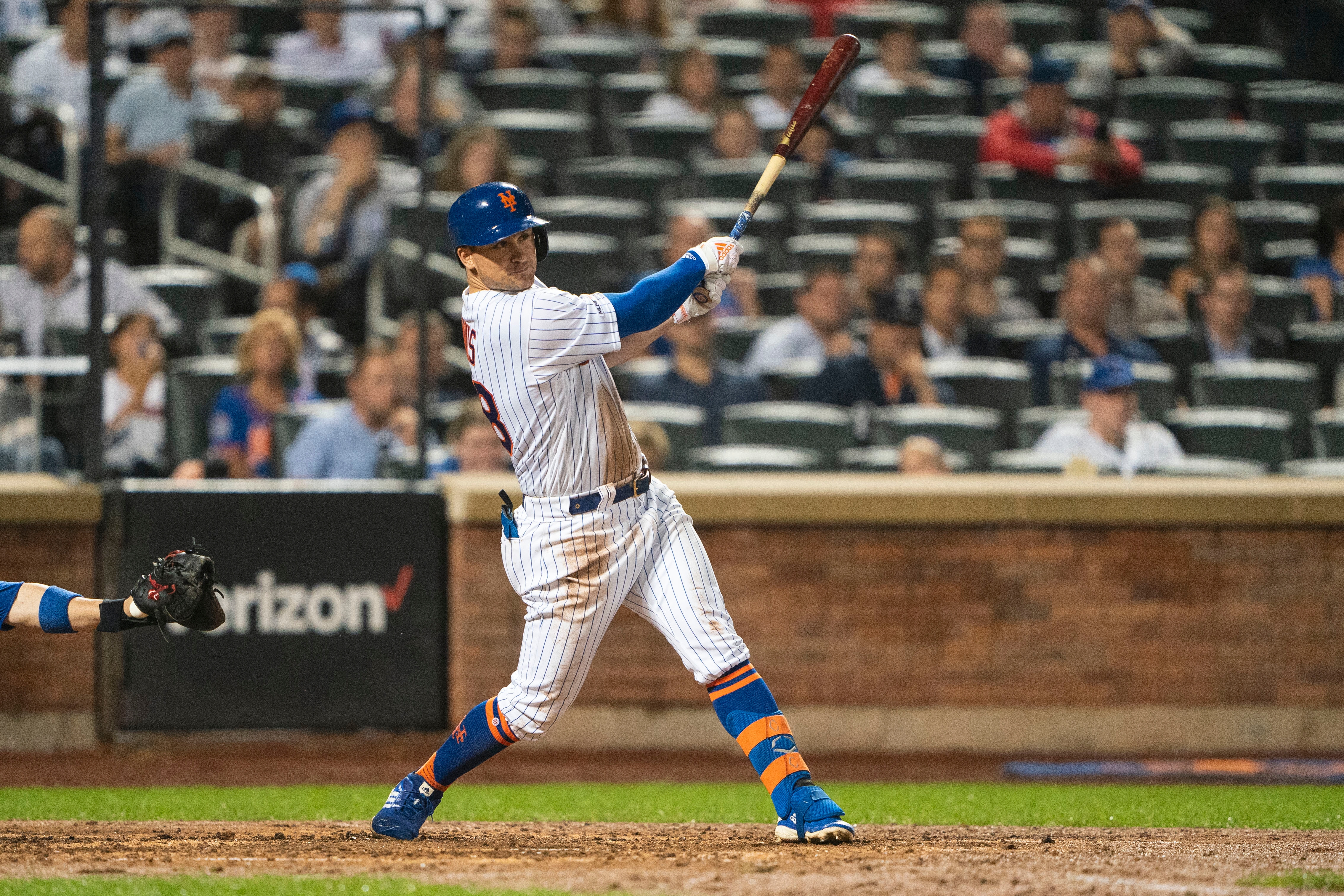 Aug 28, 2019; New York City, NY, USA; New York Mets third baseman J.D. Davis (28) hits a home run during the fifth inning against the Chicago Cubs at Citi Field. Mandatory Credit: Gregory J. Fisher-USA TODAY Sports / Gregory Fisher