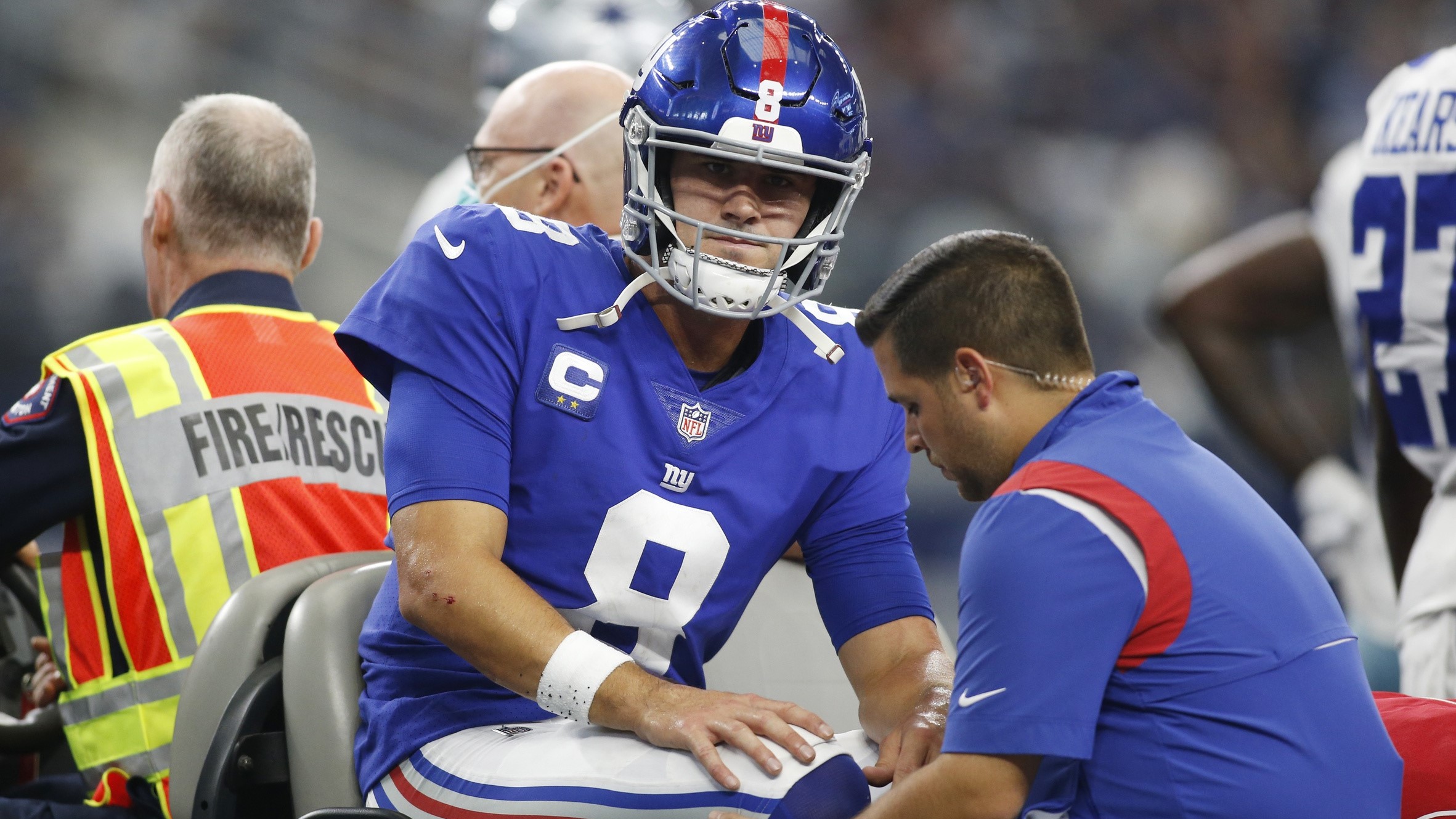 Oct 10, 2021; Arlington, Texas, USA; New York Giants quarterback Daniel Jones (8) leaves the field on a cart with an injury in the second quarter against the Dallas Cowboys at AT&T Stadium. / Tim Heitman-USA TODAY Sports