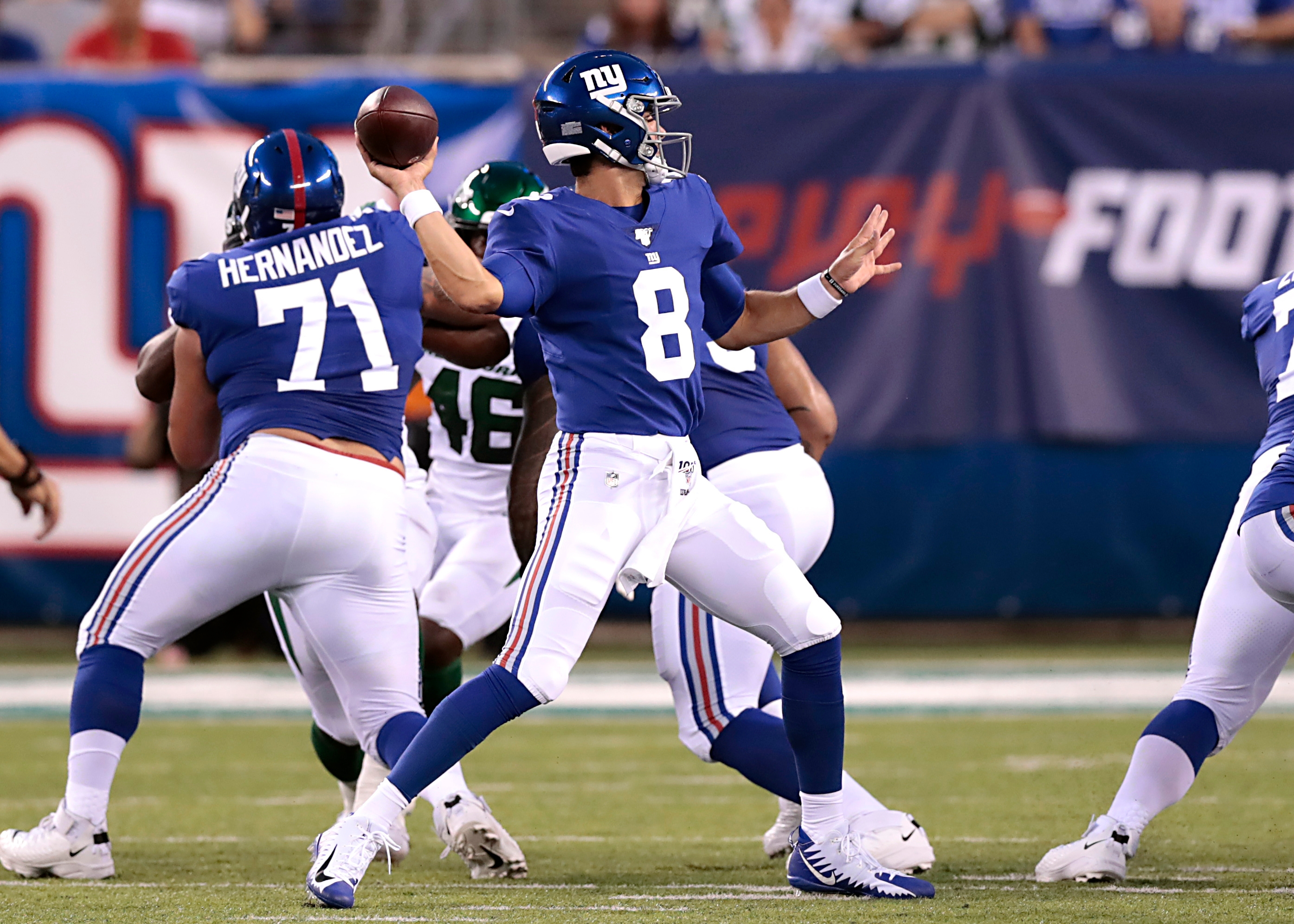 Aug 8, 2019; East Rutherford, NJ, USA; New York Giants quarterback Daniel Jones (8) throws the ball in front of offensive guard Will Hernandez (71) during the first half against the New York Jets at MetLife Stadium. Mandatory Credit: Vincent Carchietta-USA TODAY Sports / Vincent Carchietta