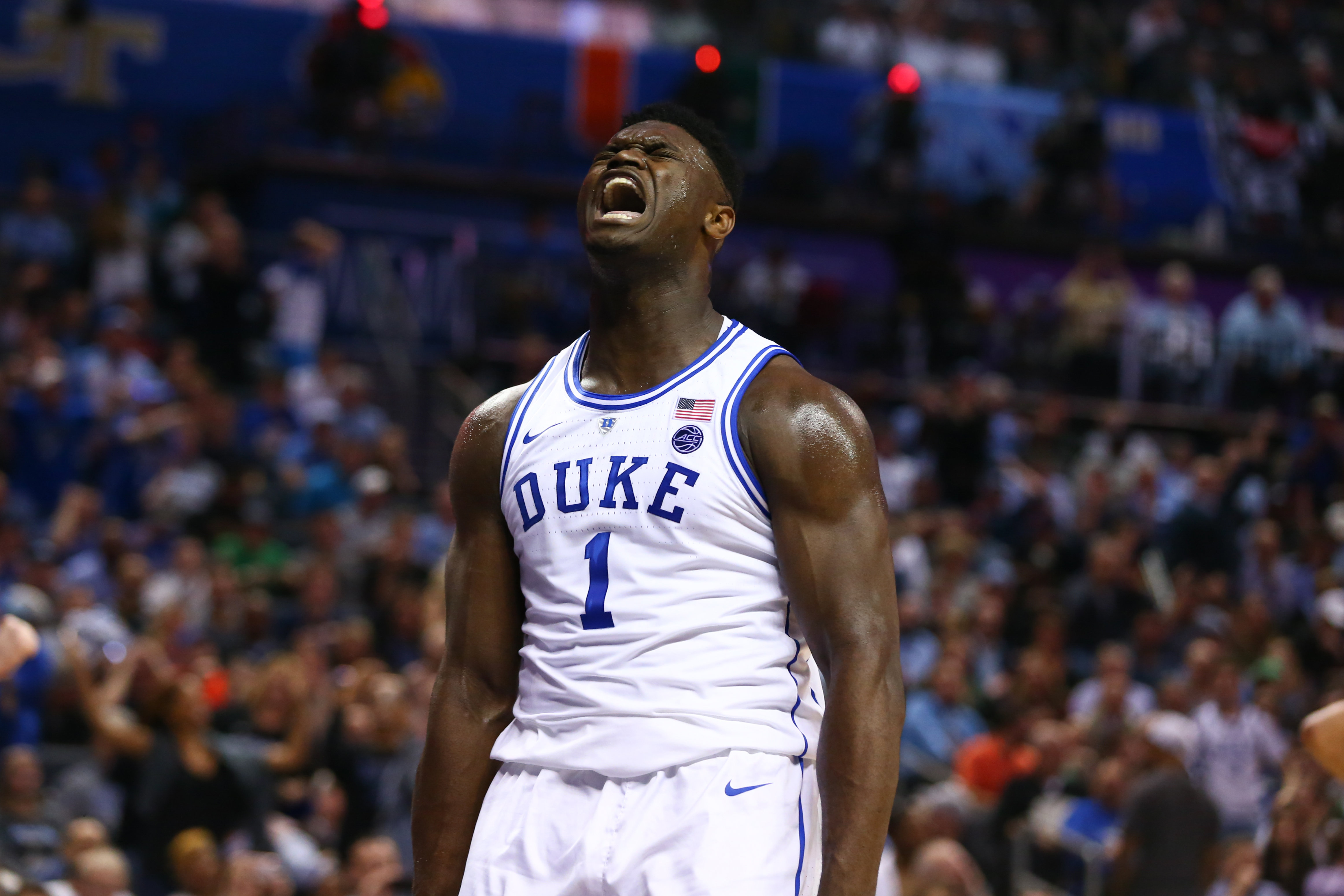 Mar 14, 2019; Charlotte, NC, USA; Duke Blue Devils forward Zion Williamson (1) reacts after a dunk in the first half against the Syracuse Orange in the ACC conference tournament at Spectrum Center. Mandatory Credit: Jeremy Brevard-USA TODAY Sports / Jeremy Brevard