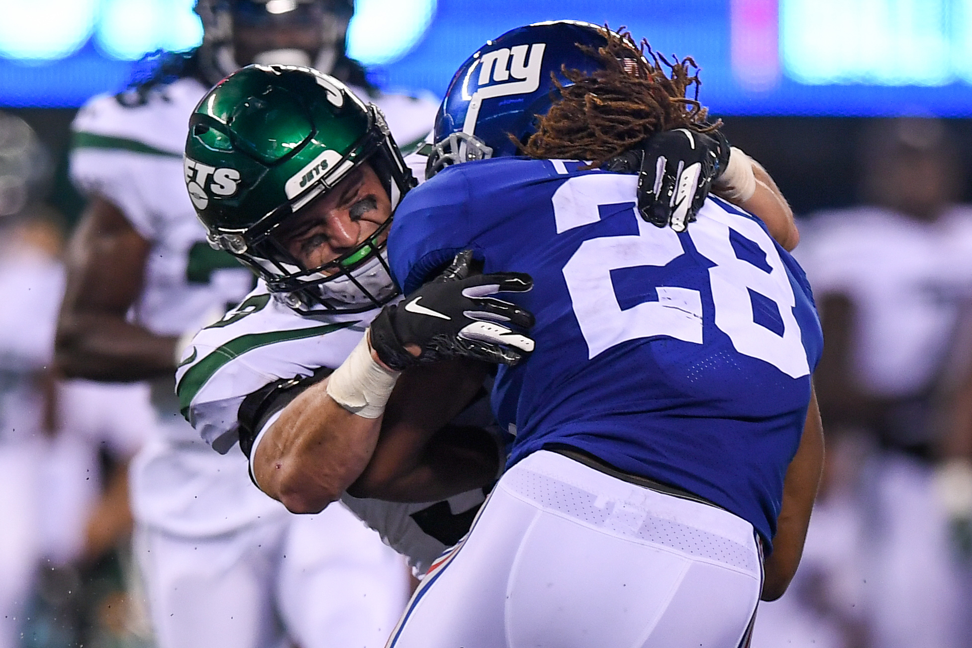 Aug 8, 2019; East Rutherford, NJ, USA; New York Jets linebacker Blake Cashman (53) tackles New York Giants running back Paul Perkins (28) during the second half at MetLife Stadium. Mandatory Credit: Dennis Schneidler-USA TODAY Sports / Dennis Schneidler