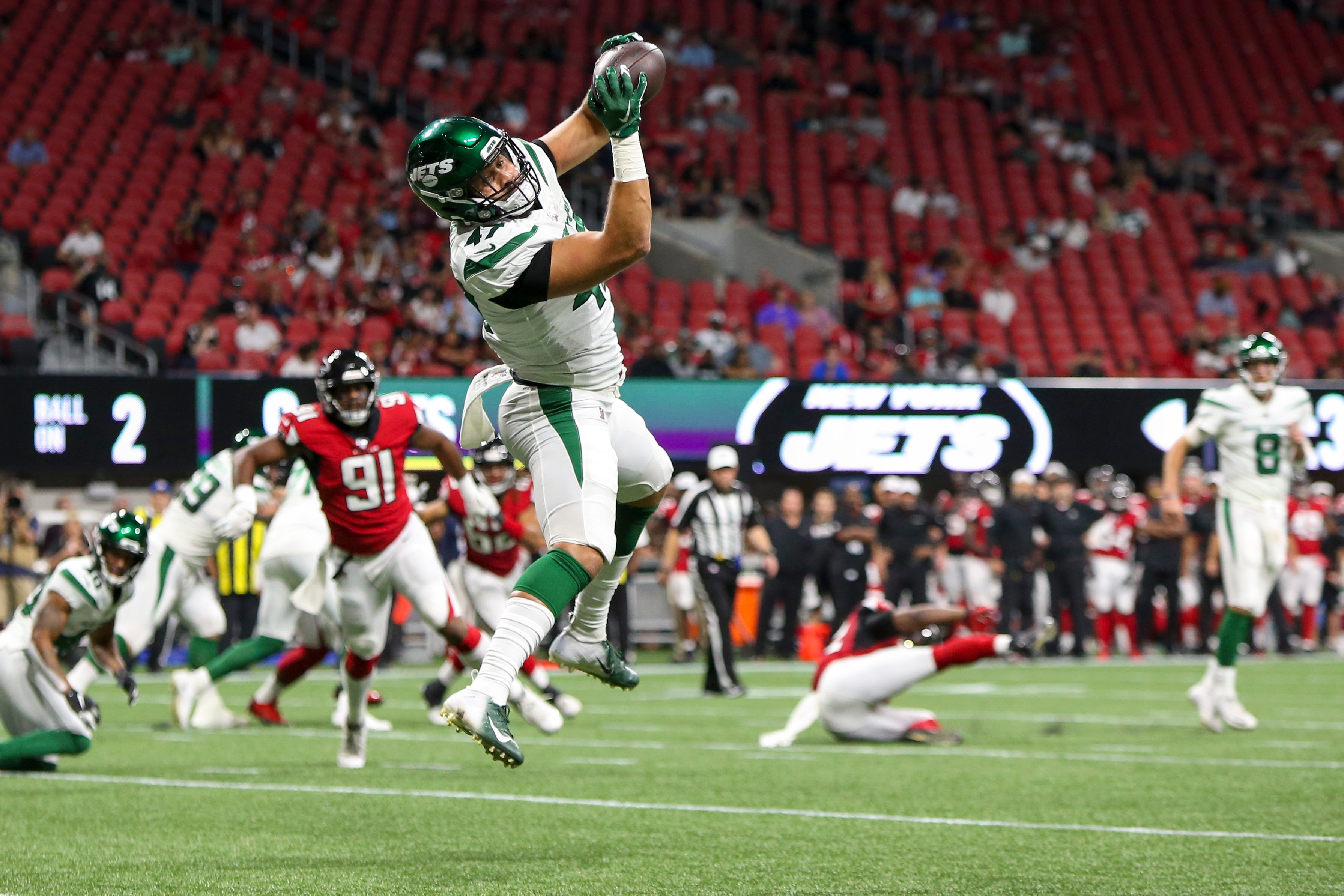New York Jets tight end Trevon Wesco (47) catches a pass against the Atlanta Falcons in the second half at Mercedes-Benz Stadium. Mandatory Credit: Brett Davis-USA TODAY Sports / Brett Davis
