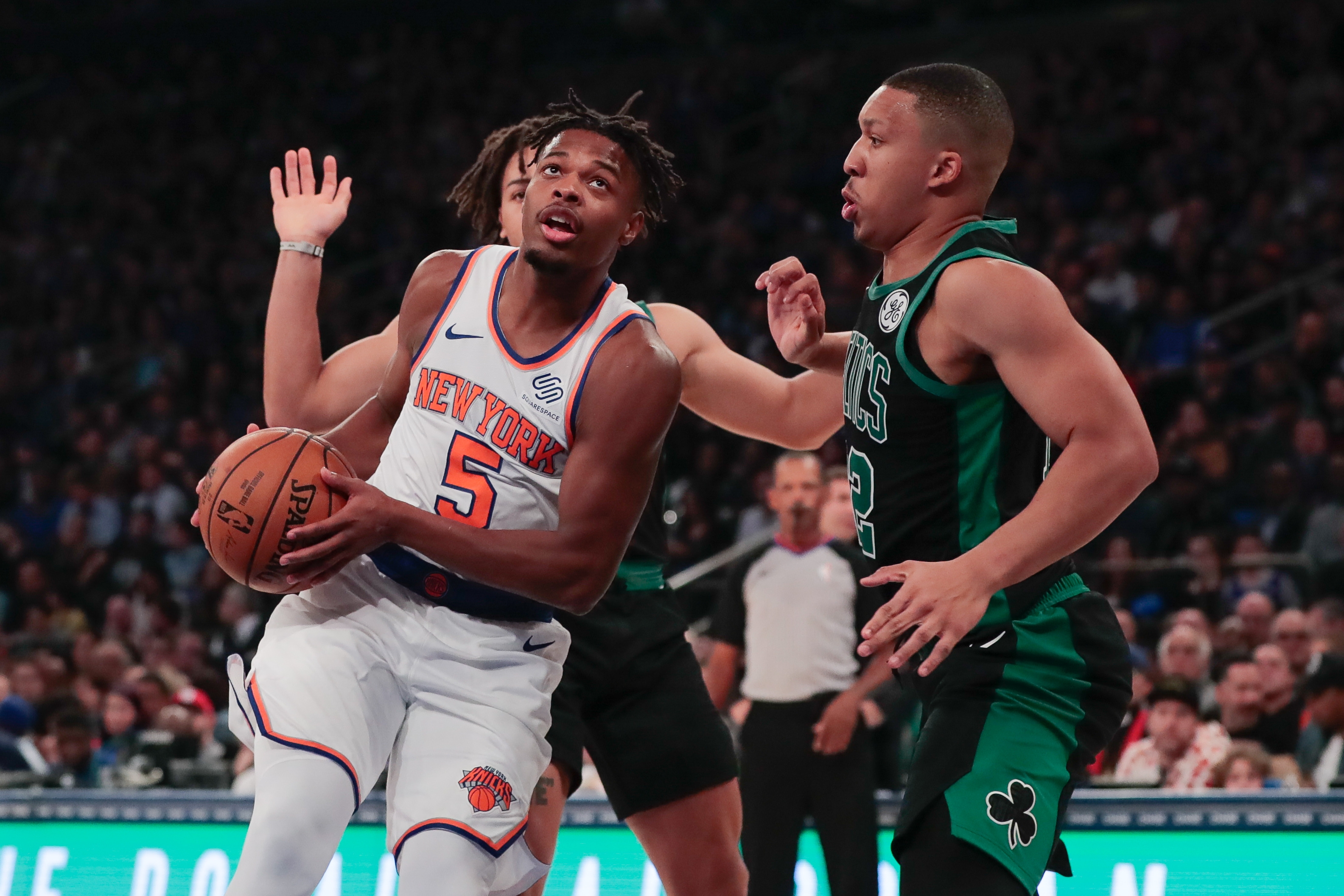 Oct 26, 2019; New York, NY, USA; New York Knicks guard Dennis Smith Jr. (5) drives to the basket as Boston Celtics forward Grant Williams (12) defends during the first half at Madison Square Garden. Mandatory Credit: Vincent Carchietta-USA TODAY Sportsundefined