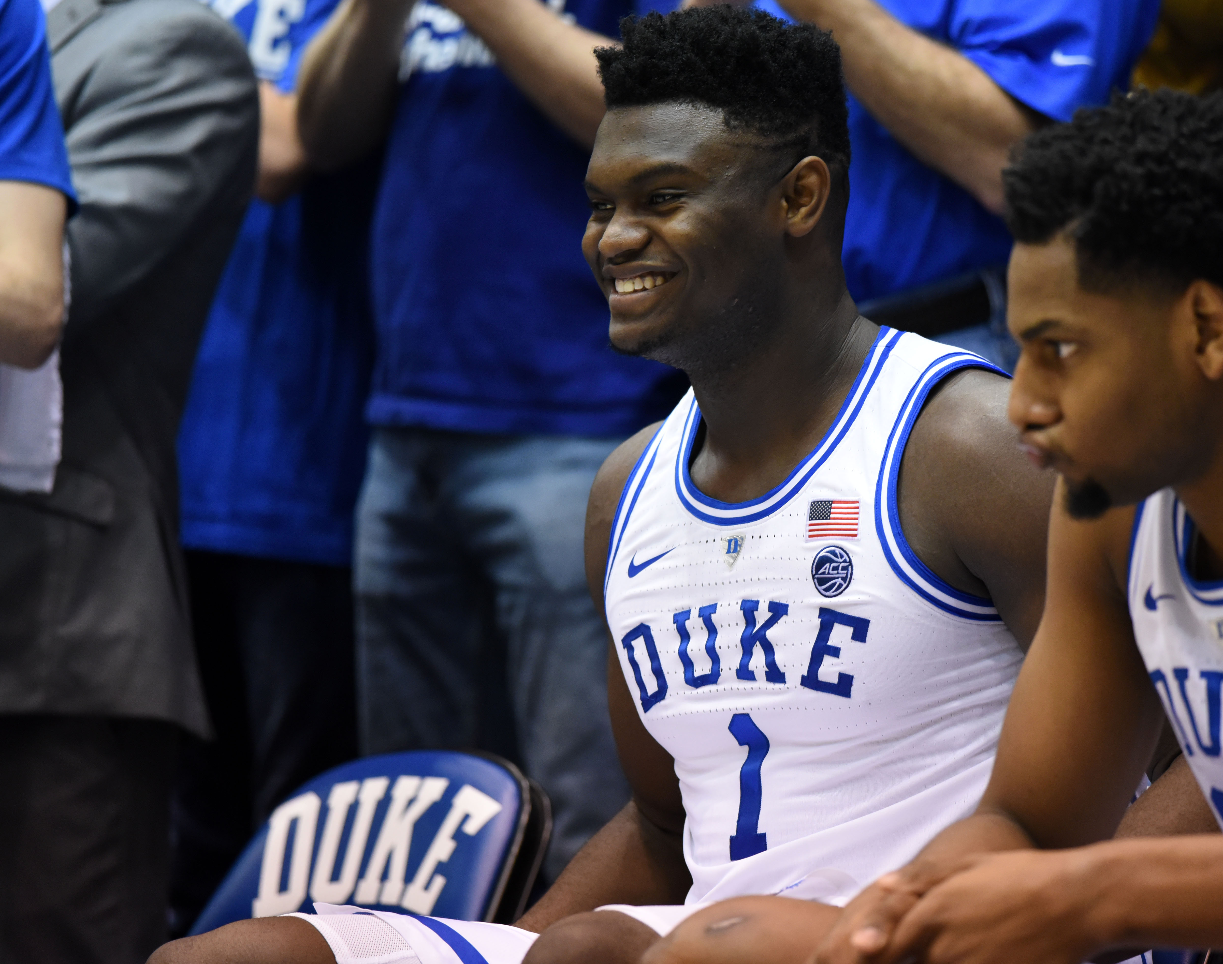Duke Blue Devils forward Zion Williamson looks on during player introductions prior to the game against the Boston College Eagles at Cameron Indoor Stadium. / Rob Kinnan/USA TODAY Sports