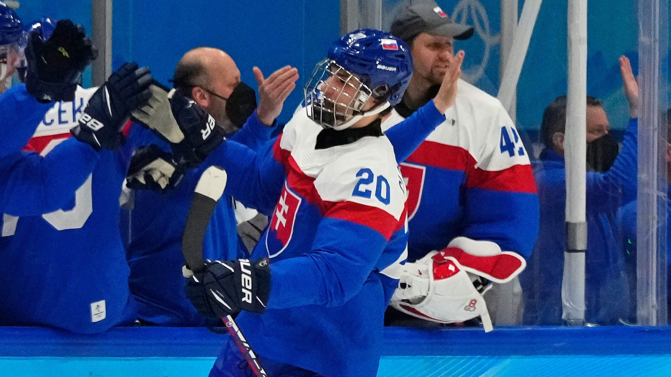 Feb 19, 2022; Beijing, China; Team Slovakia forward Juraj Slafkovsky (20) is congratulated by teammates after scoring a goal against Sweden during the second period in the bronze medal men s ice hockey game during the Beijing 2022 Olympic Winter Games at National Indoor Stadium. / George Walker IV-USA TODAY Sports