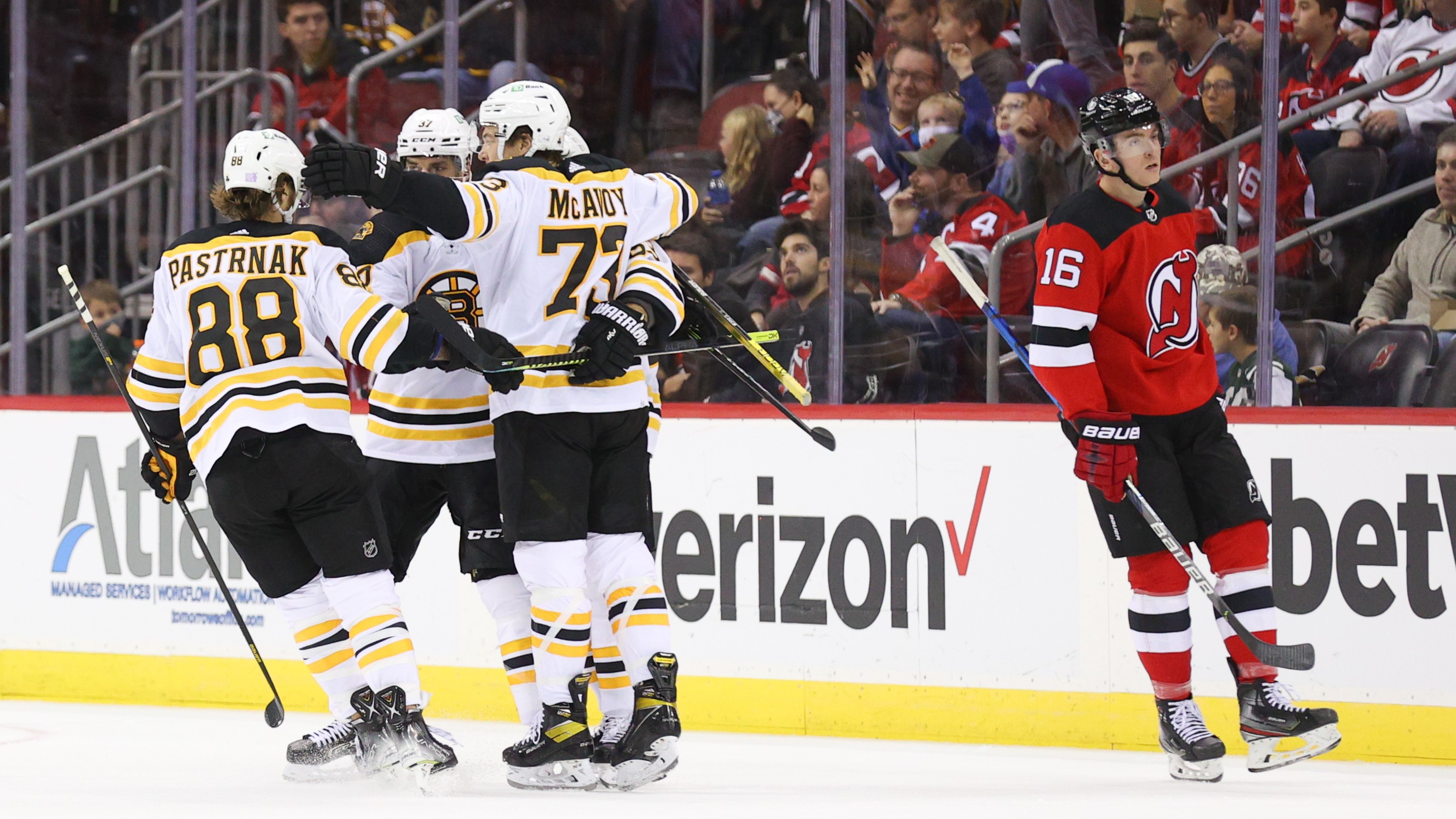 The Boston Bruins celebrate a goal by Boston Bruins center Brad Marchand (63) against the New Jersey Devils during the second period at Prudential Center. / Ed Mulholland-USA TODAY Sports