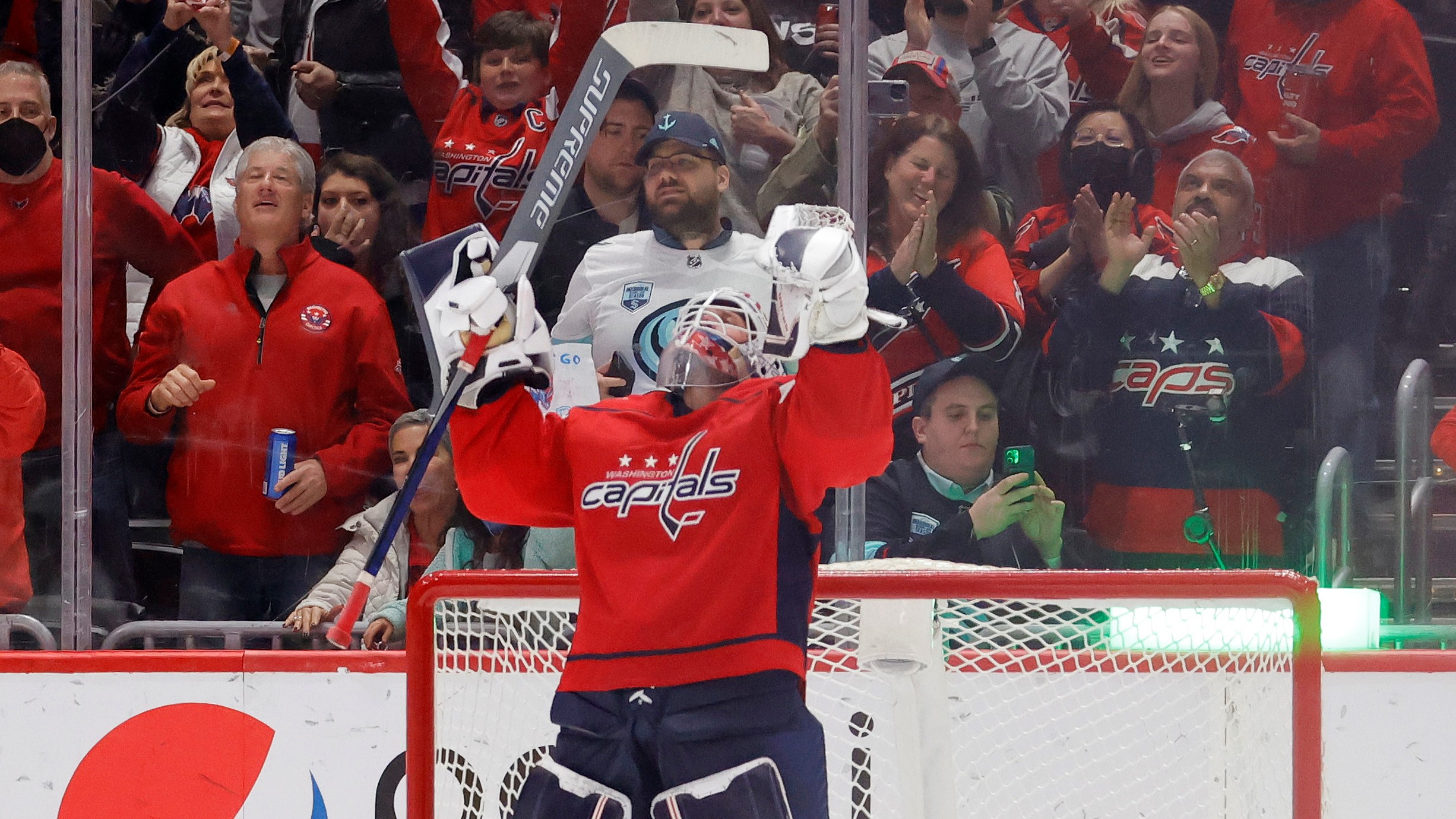 Mar 5, 2022; Washington, District of Columbia, USA; Washington Capitals goaltender Vitek Vanecek (41) celebrates after the game against the Seattle Kraken at Capital One Arena. Mandatory Credit: Geoff Burke-USA TODAY Sports / Geoff Burke-USA TODAY Sports