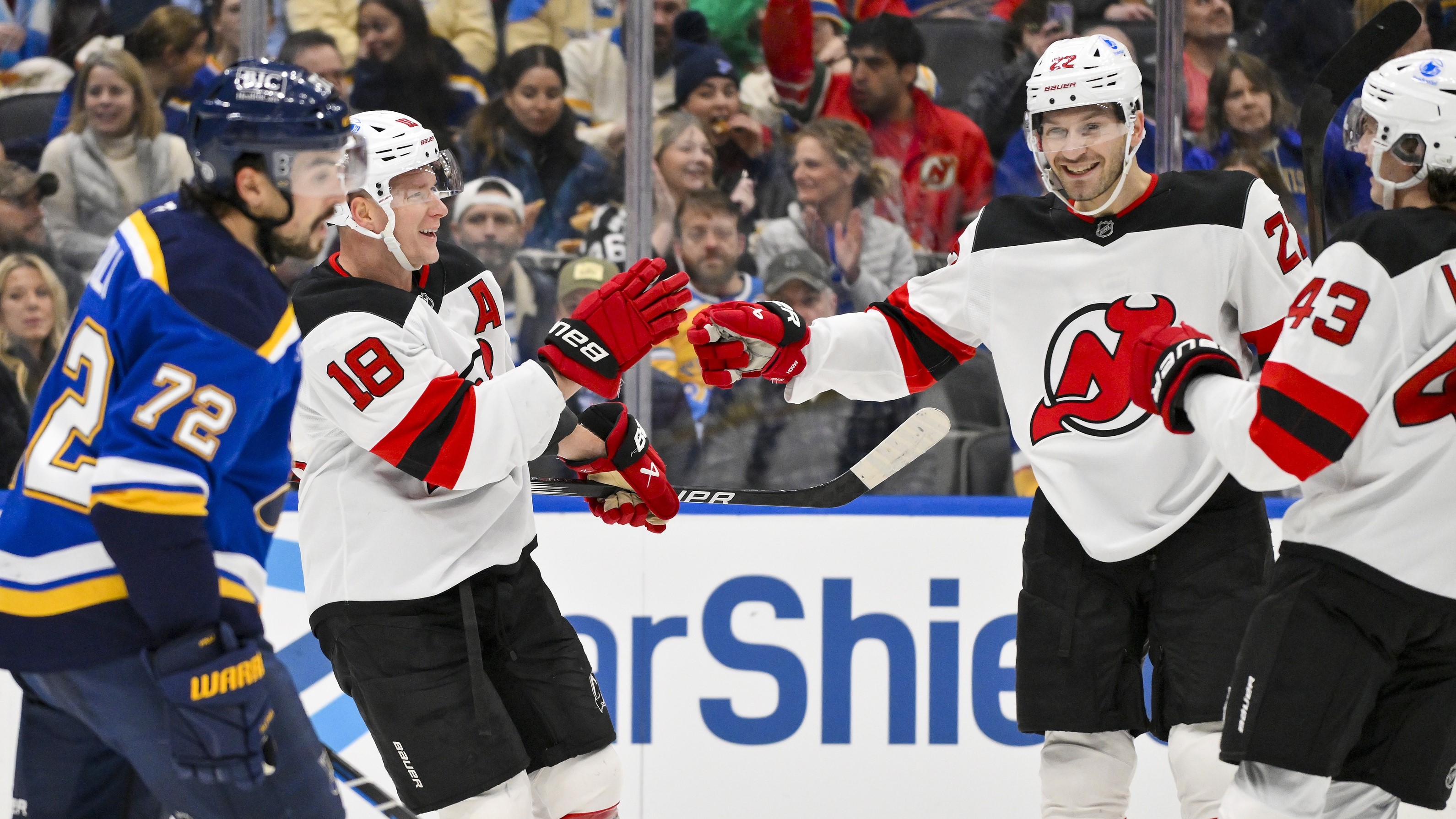 Dec 17, 2024; St. Louis, Missouri, USA; New Jersey Devils left wing Ondrej Palat (18) is congratulated by defenseman Brett Pesce (22) and defenseman Luke Hughes (43) after scoring against the St. Louis Blues during the first period at Enterprise Center. / Jeff Curry-Imagn Images