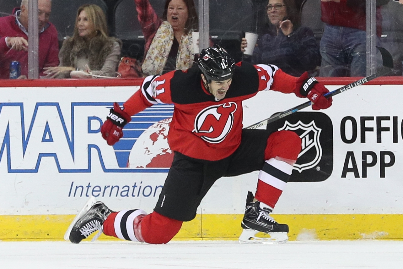 Nov 9, 2017; Newark, NJ, USA; New Jersey Devils center Brian Boyle (11) celebrates after scoring a goal during the first period against the Edmonton Oilers at Prudential Center. Mandatory Credit: Ed Mulholland-USA TODAY Sports / Ed Mulholland