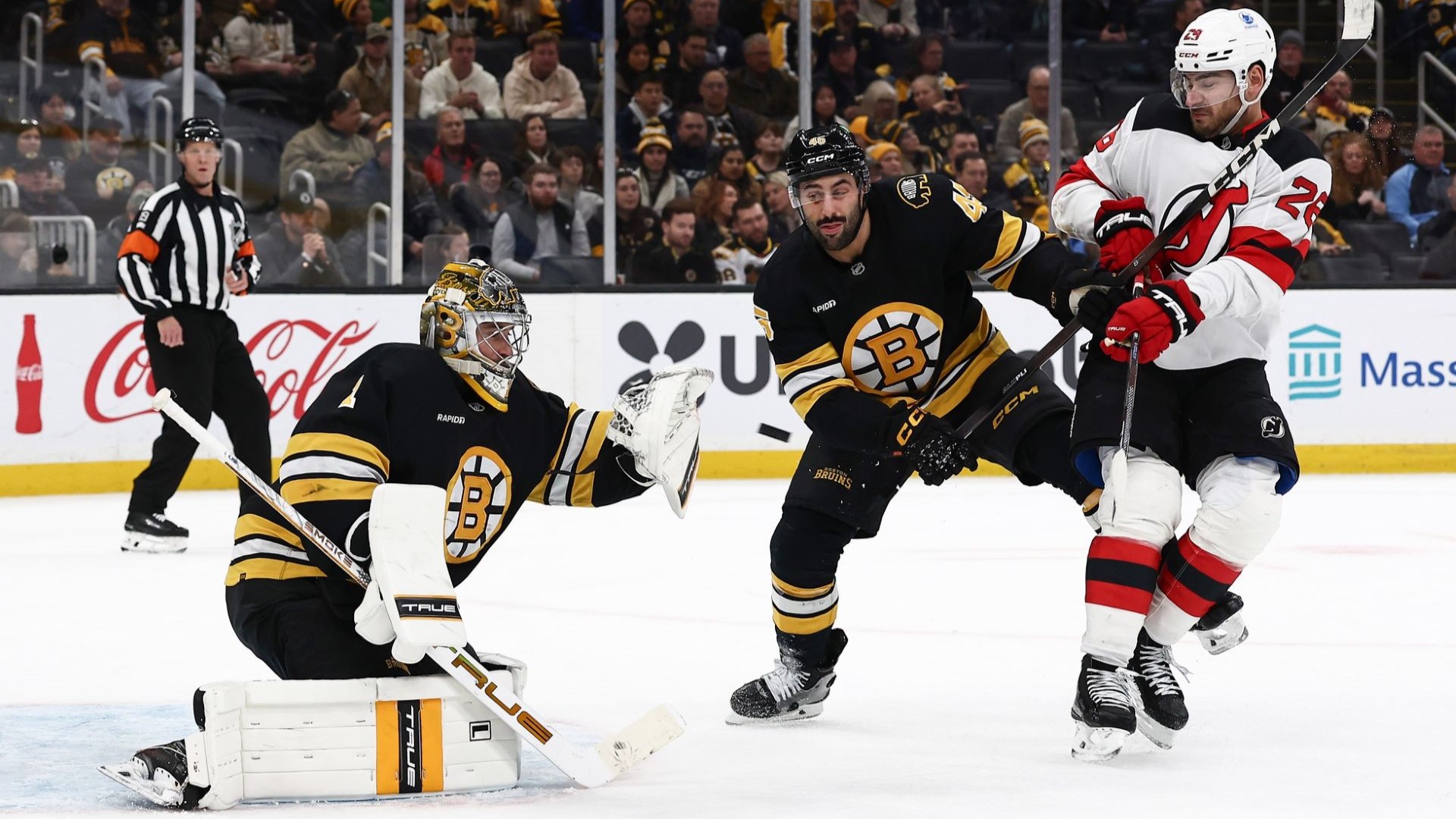 Dec 6, 2025; Boston, Massachusetts, USA; Boston Bruins goaltender Jeremy Swayman (1) makes a glove save as Boston Bruins defenseman Jonathan Aspirot (45) keeps New Jersey Devils right wing Timo Meier (28) from a rebound during the second period at TD Garden. / Winslow Townson-Imagn Images