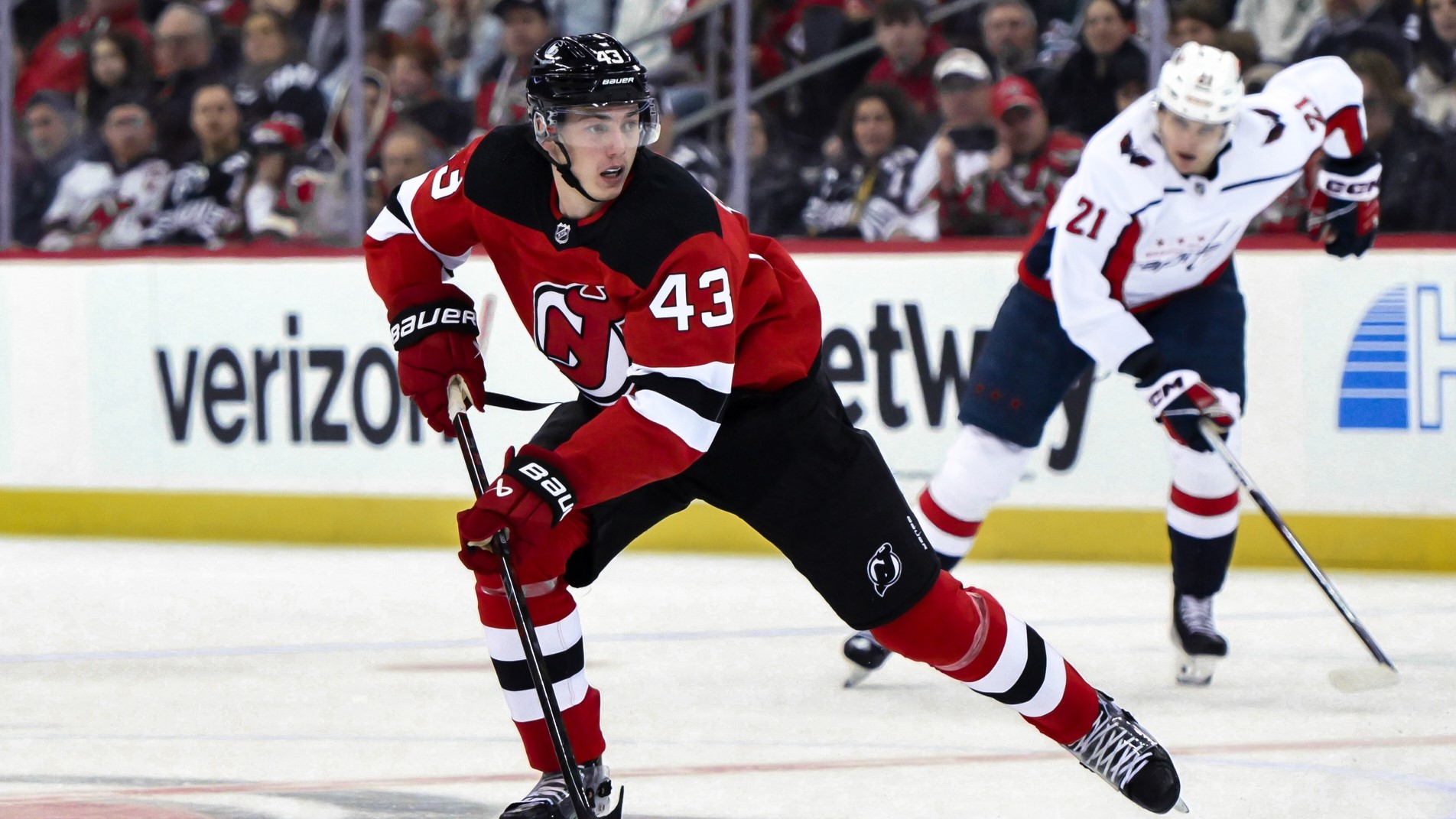 Nov 10, 2023; Newark, New Jersey, USA; New Jersey Devils defenseman Luke Hughes (43) skates with the puck against as Washington Capitals center Aliaksei Protas (21) trails the play during the second period at Prudential Center. / John Jones-USA TODAY Sports