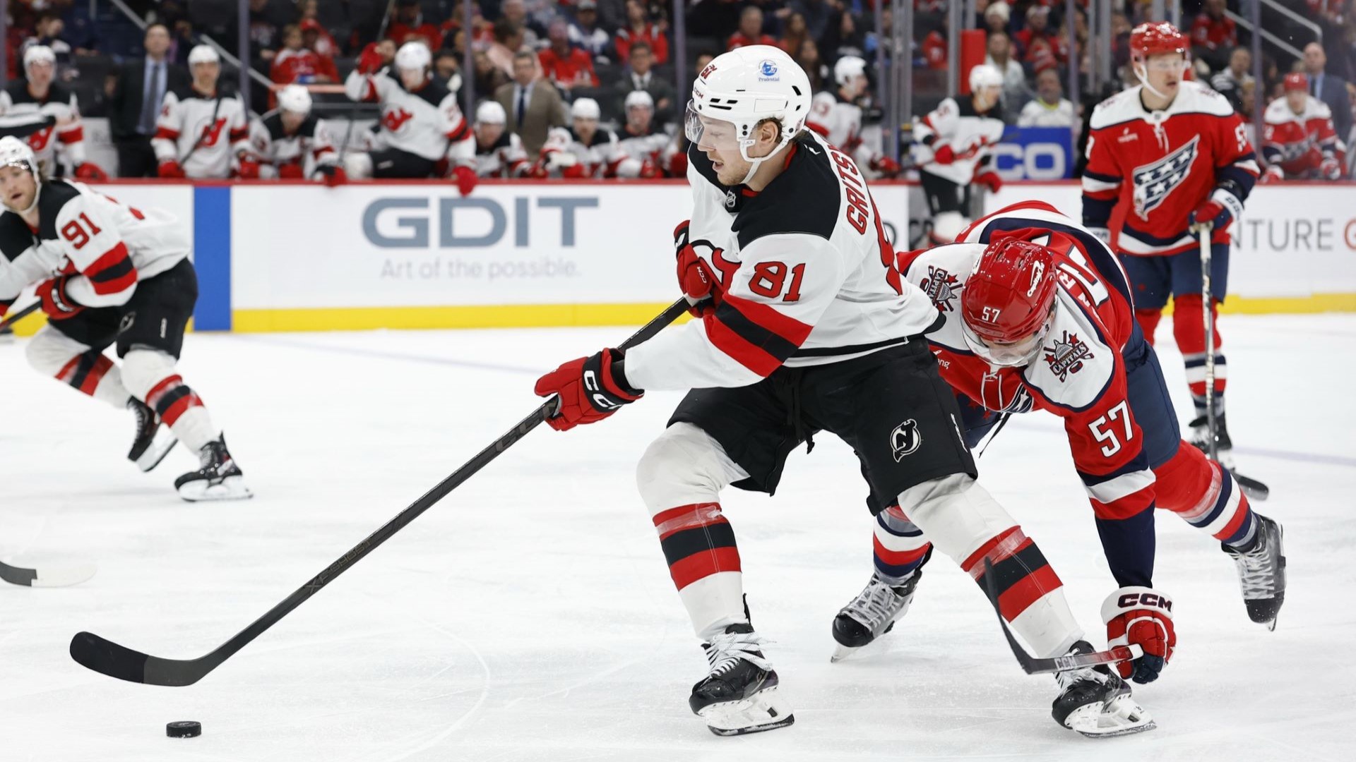 Nov 15, 2025; Washington, District of Columbia, USA; New Jersey Devils right wing Arseny Gritsyuk (81) skates with the puck against as Washington Capitals defenseman Trevor van Riemsdyk (57) chases during the second period at Capital One Arena. / Geoff Burke-Imagn Images
