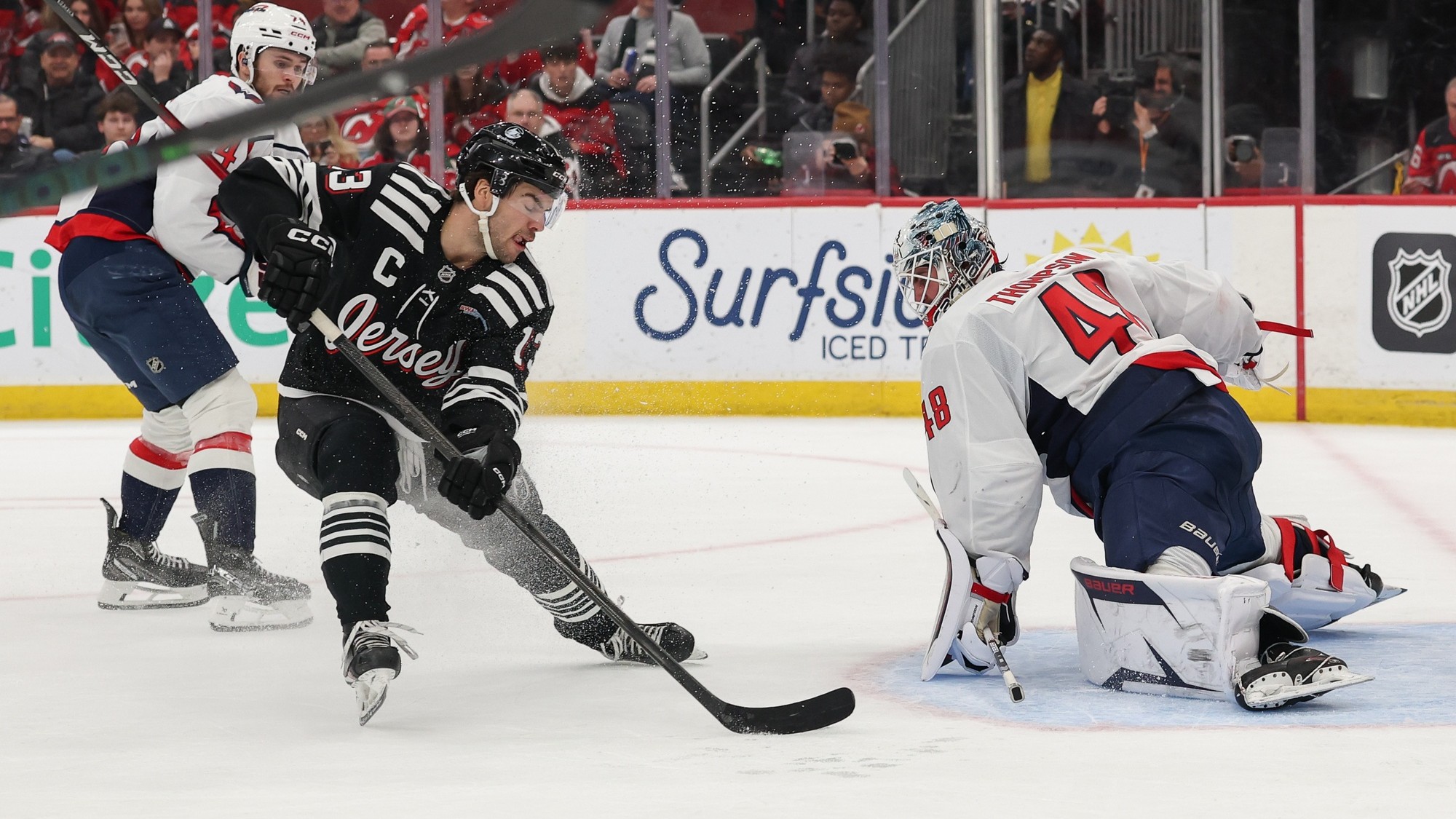 Devils drop third straight game after 4-3 loss to Capitals in OTNew Jersey has lost four of last six games12/28/2025, 3:11 AMAssociated PressDec 27, 2025; Newark, New Jersey, USA; Washington Capitals goaltender Logan Thompson (48) makes a save on New Jersey Devils center Nico Hischier (13) during the second period at Prudential Center. / Ed Mulholland-Imagn Images