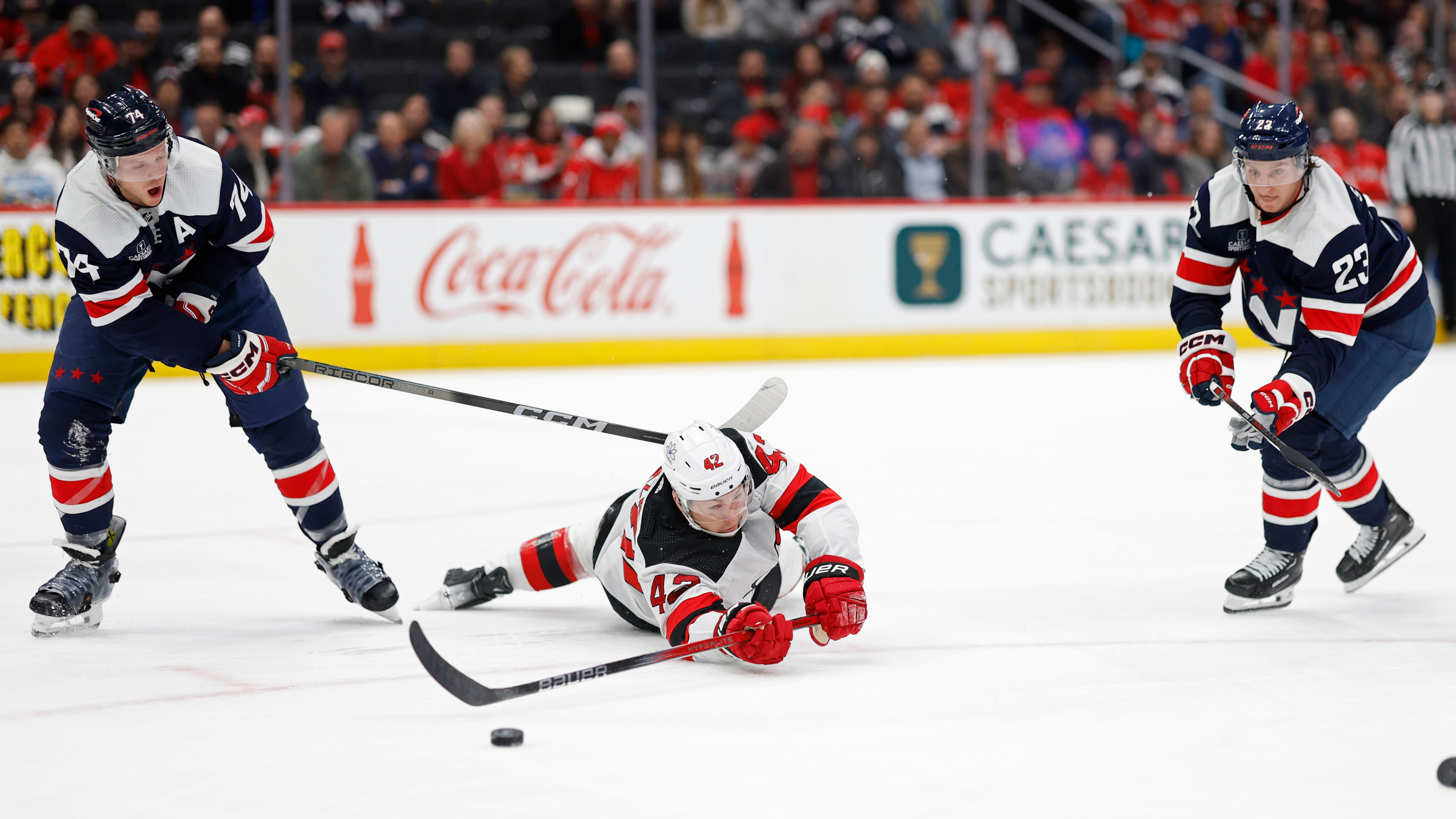 Devils fall to Capitals in 6-2 routNew Jersey allows four goals in third period in massive letdown game2/21/2024, 3:31 AMAssociated PressNew Jersey Devils center Curtis Lazar (42) battles for the puck with Washington Capitals defenseman John Carlson (74) and Capitals center Michael Sgarbossa (23) in the first period at Capital One Arena. / Geoff Burke-USA TODAY Sports