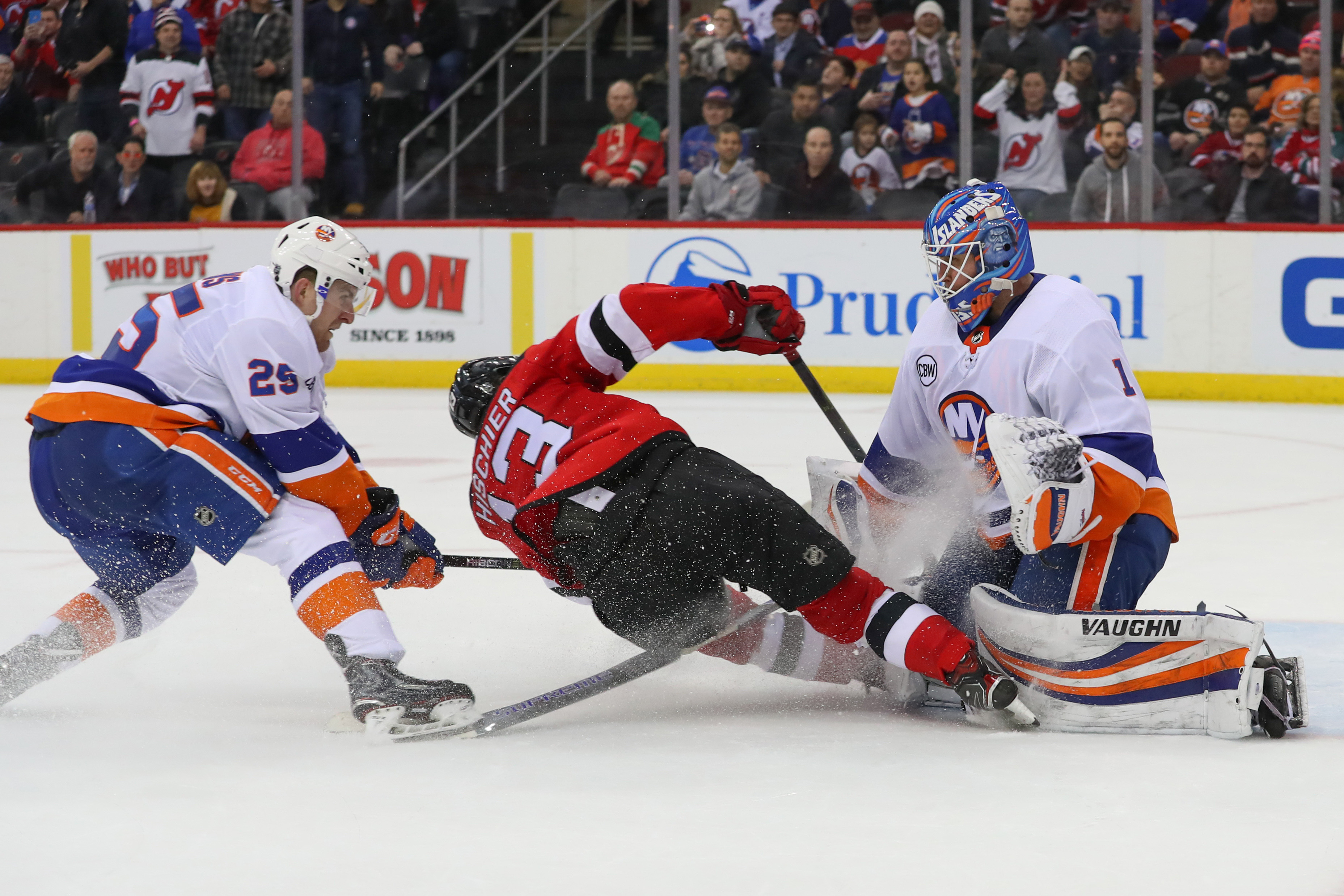 Feb 7, 2019; Newark, NJ, USA; New Jersey Devils center Nico Hischier (13) crashes into New York Islanders goaltender Thomas Greiss (1) after a save by Greiss during the third period at Prudential Center. Mandatory Credit: Ed Mulholland-USA TODAY Sports / Ed Mulholland