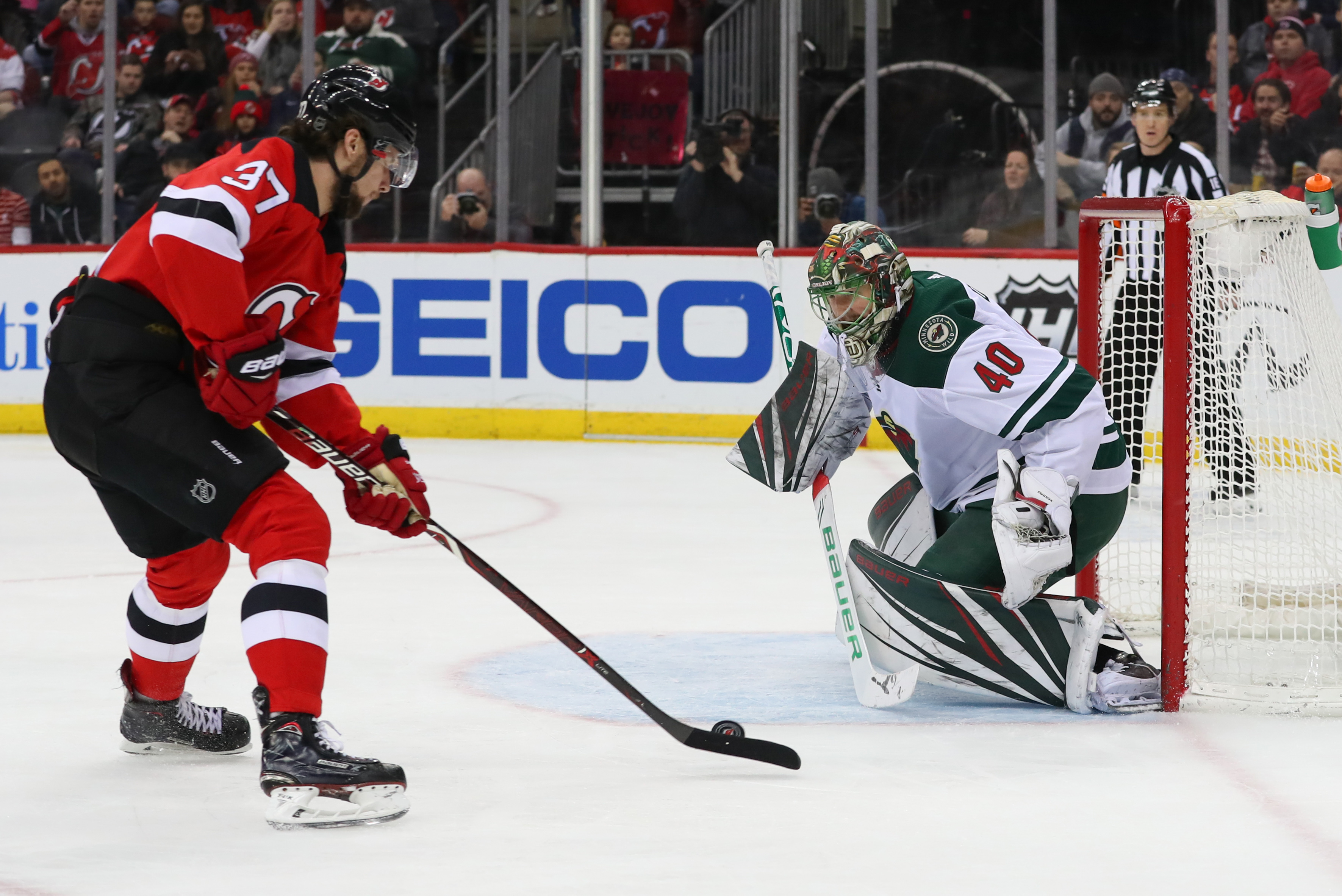 Devils fall to Wild, 4-2, at The RockSeney and Bratt scored for New Jersey2/9/2019, 9:12 PMFeb 9, 2019; Newark, NJ, USA; Minnesota Wild goaltender Devan Dubnyk (40) makes a save against New Jersey Devils center Pavel Zacha (37) during the second period at Prudential Center. Mandatory Credit: Ed Mulholland-USA TODAY Sports / Ed Mulholland