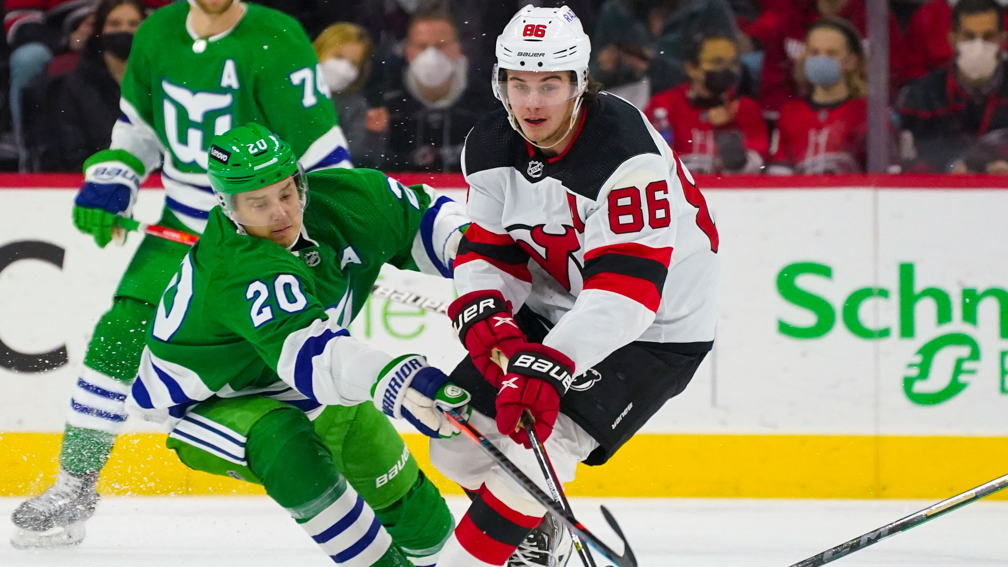 Jan 29, 2022; Raleigh, North Carolina, USA; New Jersey Devils center Jack Hughes (86) tries to control the puck against Carolina Hurricanes center Sebastian Aho (20) first period at PNC Arena. / James Guillory-USA TODAY Sports