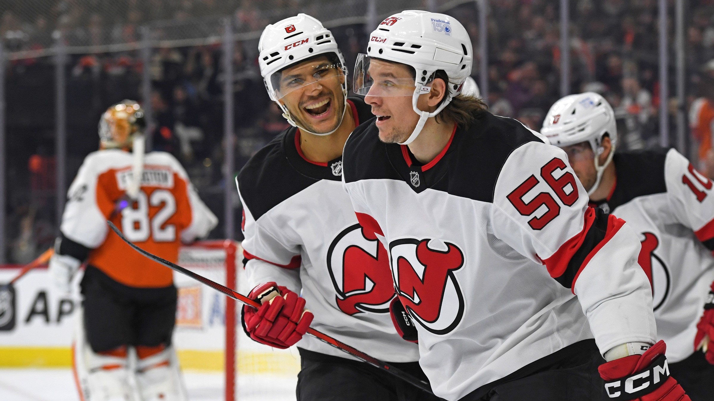 Erik Haula scores goal, adds an assist as Devils defeat Flyers, 3-1Jake Allen stopped 23 of 24 shots that came his way3/9/2025, 8:15 PMAssociated PressMar 9, 2025; Philadelphia, Pennsylvania, USA; New Jersey Devils left wing Erik Haula (56) celebrates his goal with defenseman Johnathan Kovacevic (8) asf during the second period at Wells Fargo Center. / Eric Hartline-Imagn Images