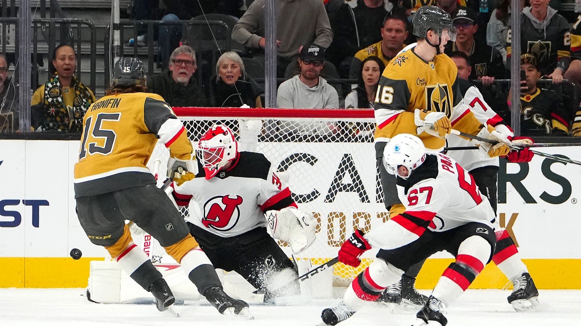 Jake Allen makes 37 saves in Devils' 2-1 shootout win over Golden KnightsJesper Bratt scored the winner for NJ12/18/2025, 6:06 AMAssociated PressDec 17, 2025; Las Vegas, Nevada, USA; New Jersey Devils goaltender Jake Allen (34) makes a save against Vegas Golden Knights defenseman Noah Hanifin (15) during the first period at T-Mobile Arena. / Stephen R. Sylvanie-Imagn Images