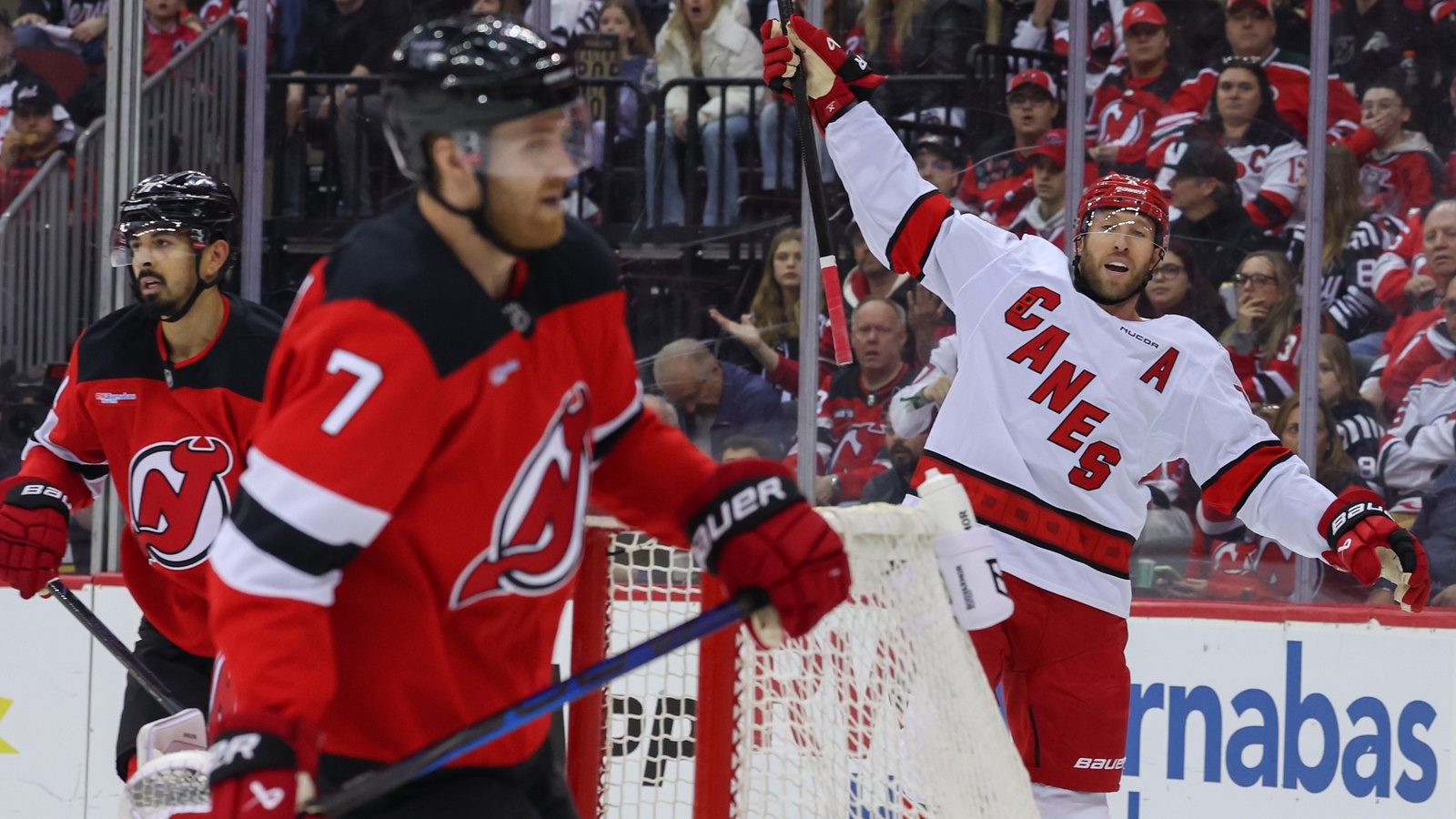 Devils drop Game 4 to Hurricanes, 5-2, one game away from first-round exitSeries heads back to North Carolina for Game 5 on Tuesday4/27/2025, 11:16 PMAssociated PressCarolina Hurricanes defenseman Jaccob Slavin (74) celebrates his goal against the New Jersey Devils during the first period in game four of the first round of the 2025 Stanley Cup Playoffs at Prudential Center. / Ed Mulholland-Imagn Images
