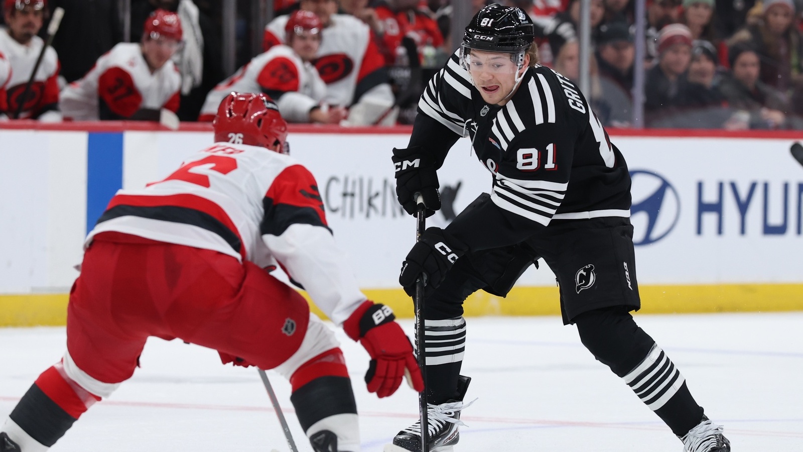 Devils go quietly in 4-1 loss to HurricanesTimo Meier scored New Jersey's only goal in third period1/18/2026, 3:11 AMAssociated PressNew Jersey Devils right wing Arseny Gritsyuk (81) skates with the puck as Carolina Hurricanes defenseman Sean Walker (26) defends during the second period at Prudential Center. / Thomas Salus-Imagn Images