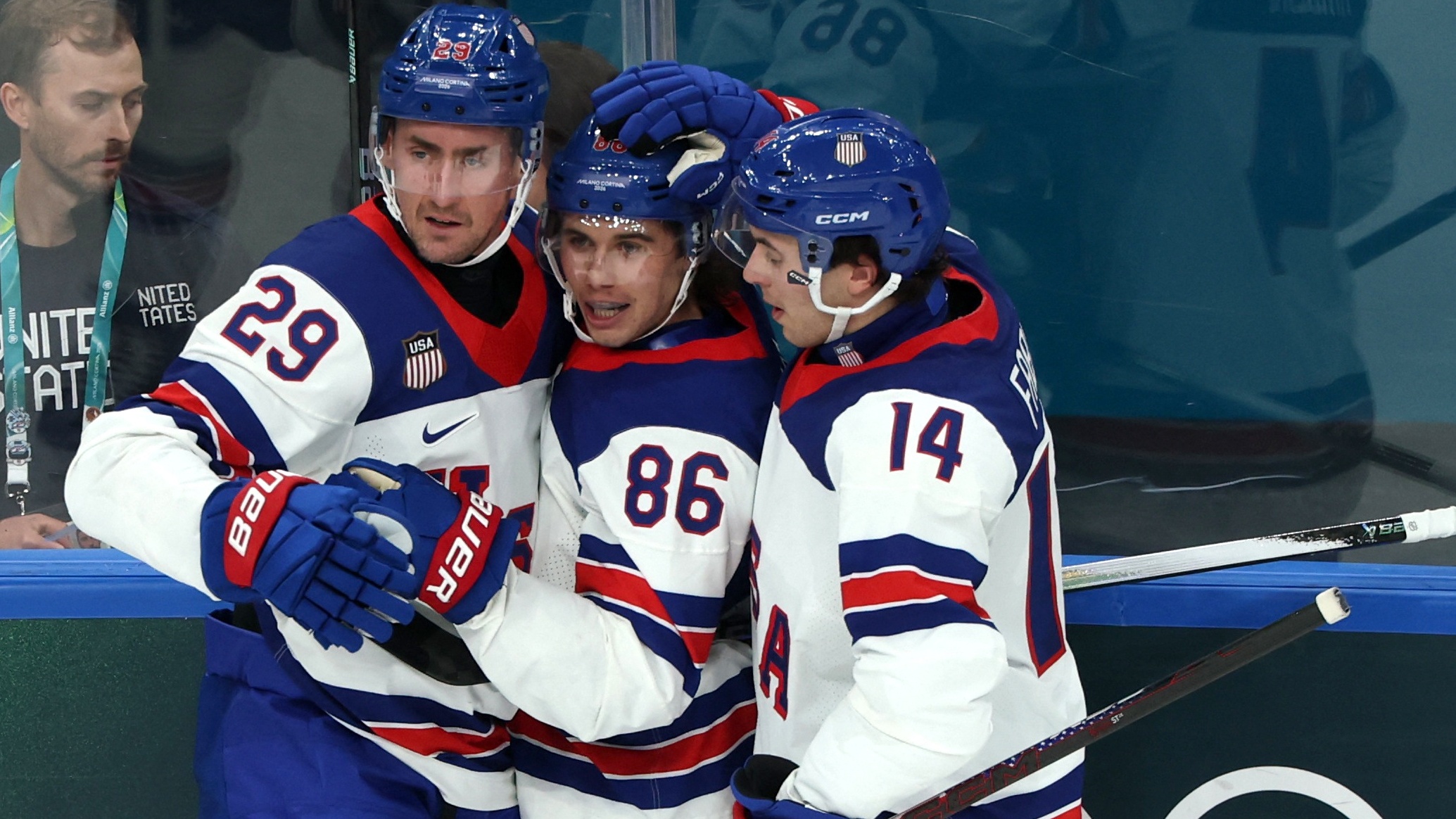 Brock Nelson of United States celebrates scoring their second goal with Jack Hughes of United States and Brock Faber of United States against Latvia in men's ice hockey group C play during the Milano Cortina 2026 Olympic Winter Games at Milano Santagiulia Ice Hockey Arena / Mike Segar - Reuters via Imagn Images