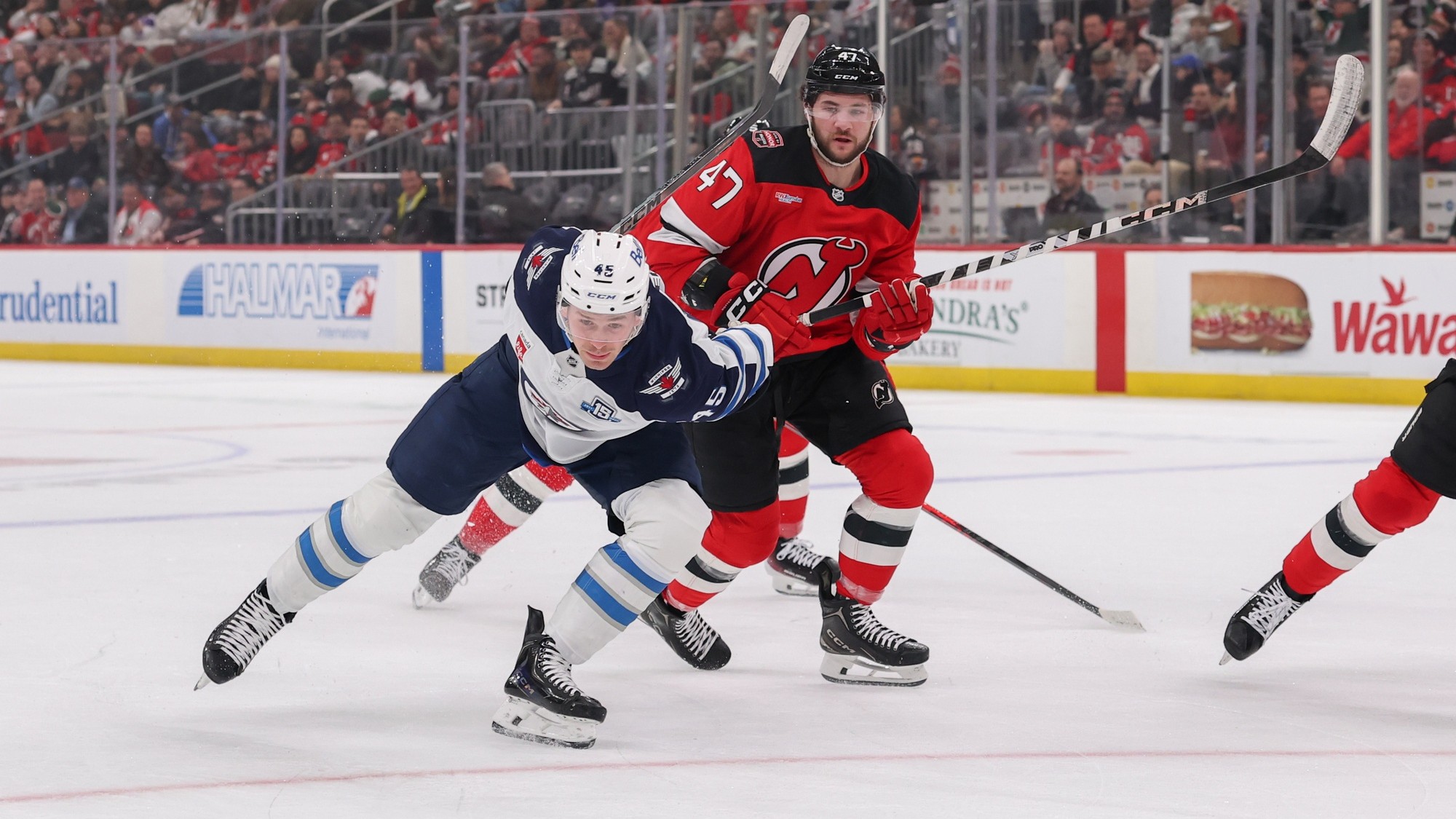 Devils score late, but fall to Jets for second straight lossNico Hischier scored with 1:46 left in the third period1/28/2026, 2:56 AMAssociated PressJan 27, 2026; Newark, New Jersey, USA; Winnipeg Jets left wing Cole Koepke (45) and New Jersey Devils left wing Paul Cotter (47) battle for the puck during the first period at Prudential Center. / Ed Mulholland-Imagn Images