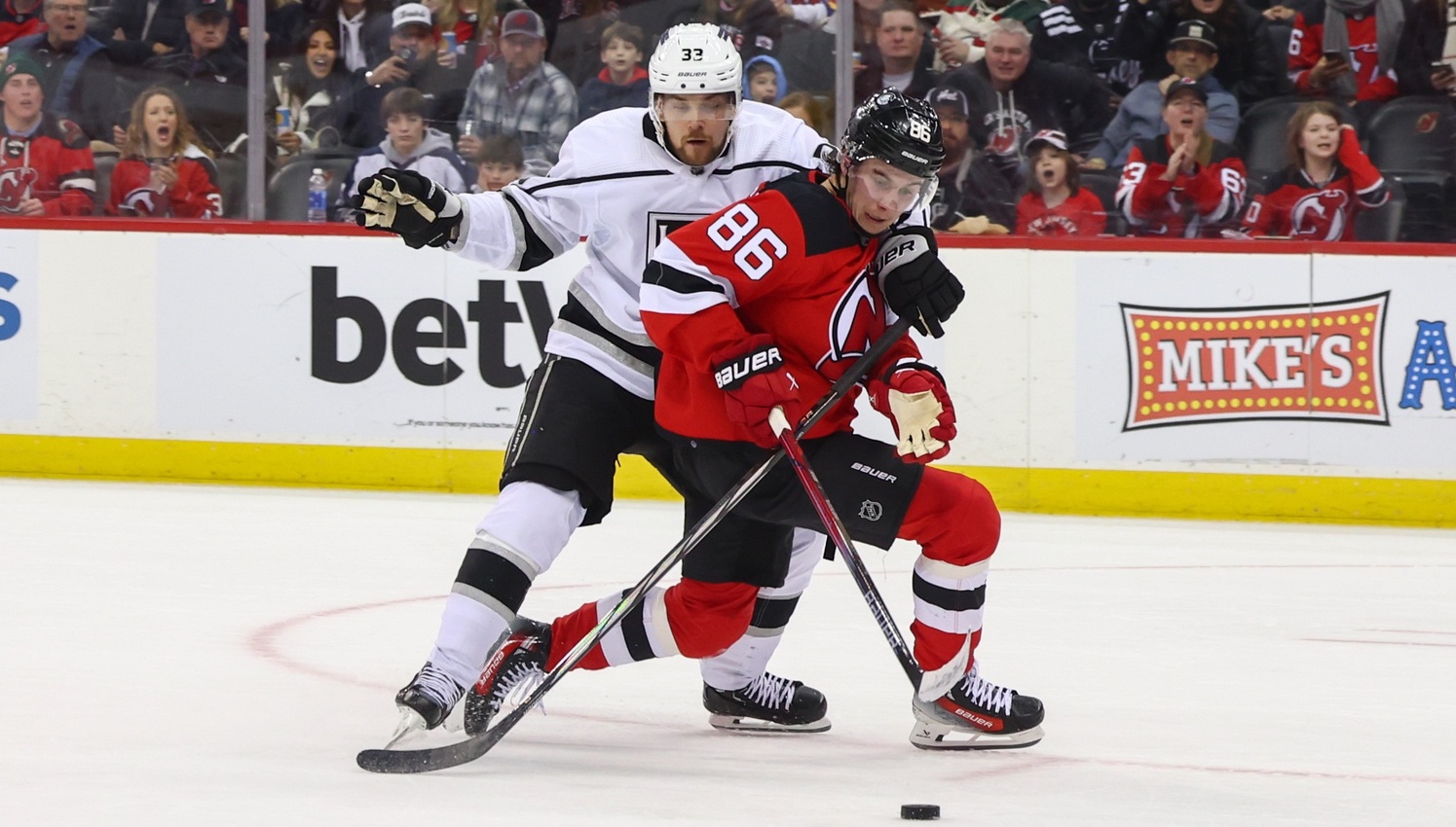 Devils snap mini two-game skid with 3-1 win over KingsNew Jersey went down 1-0 before ripping off three straight goals12/13/2024, 3:12 AMAssociated PressNew Jersey Devils center Jack Hughes (86) skates with the puck while being defended by Los Angeles Kings right wing Viktor Arvidsson (33) during the second period at Prudential Center. / Ed Mulholland-USA TODAY Sports