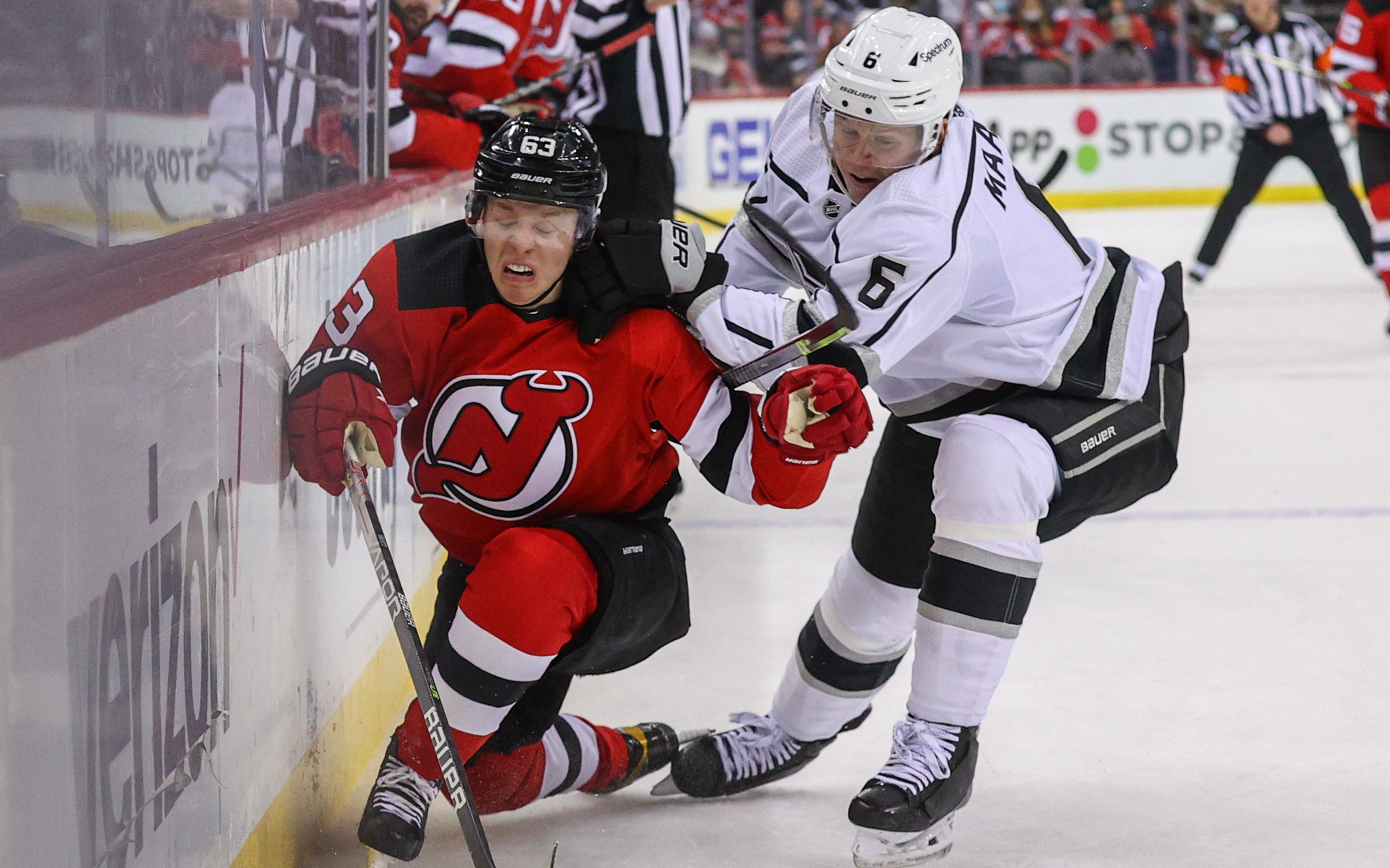 Devils go cold after Jesper Bratt's first-period goals, fall 3-2 to KingsLos Angeles completed comeback midway through third period1/24/2022, 3:12 AMJan 23, 2022; Newark, New Jersey, USA; Los Angeles Kings defenseman Olli Maatta (6) hits New Jersey Devils left wing Jesper Bratt (63) during the second period at Prudential Center. Mandatory Credit: Ed Mulholland-USA TODAY Sports / © Ed Mulholland-USA TODAY Sports