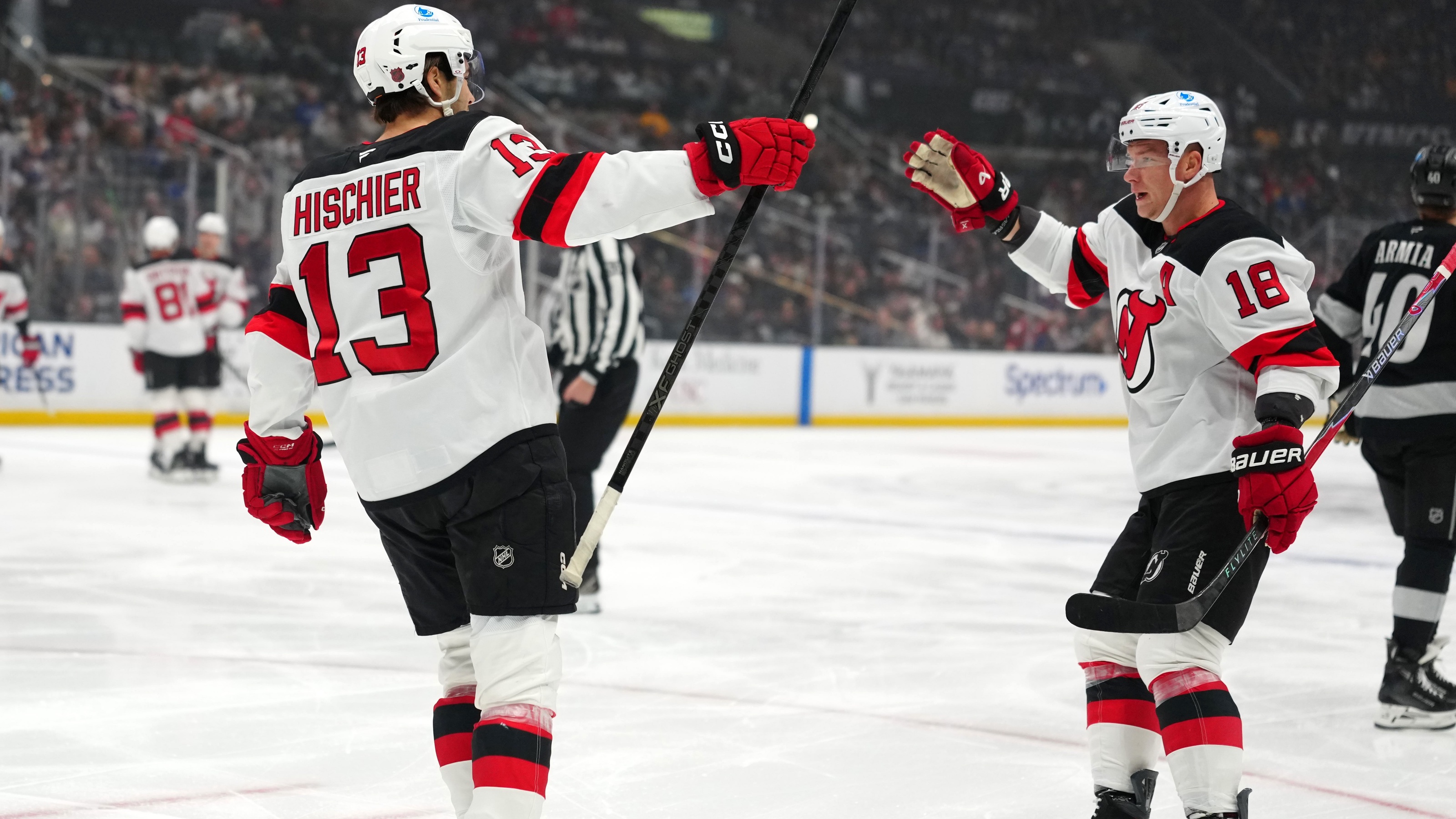Devils snap two-game skid with 4-1 win over KingsBrian Halonen scored his first NHL goal11/2/2025, 3:54 AMAssociated PressNew Jersey Devils center Nico Hischier (13) and left wing Ondrej Palat (18) celebrate after a goal against the Los Angeles Kings in the first period at Crypto.com Arena. / Kirby Lee-Imagn Images