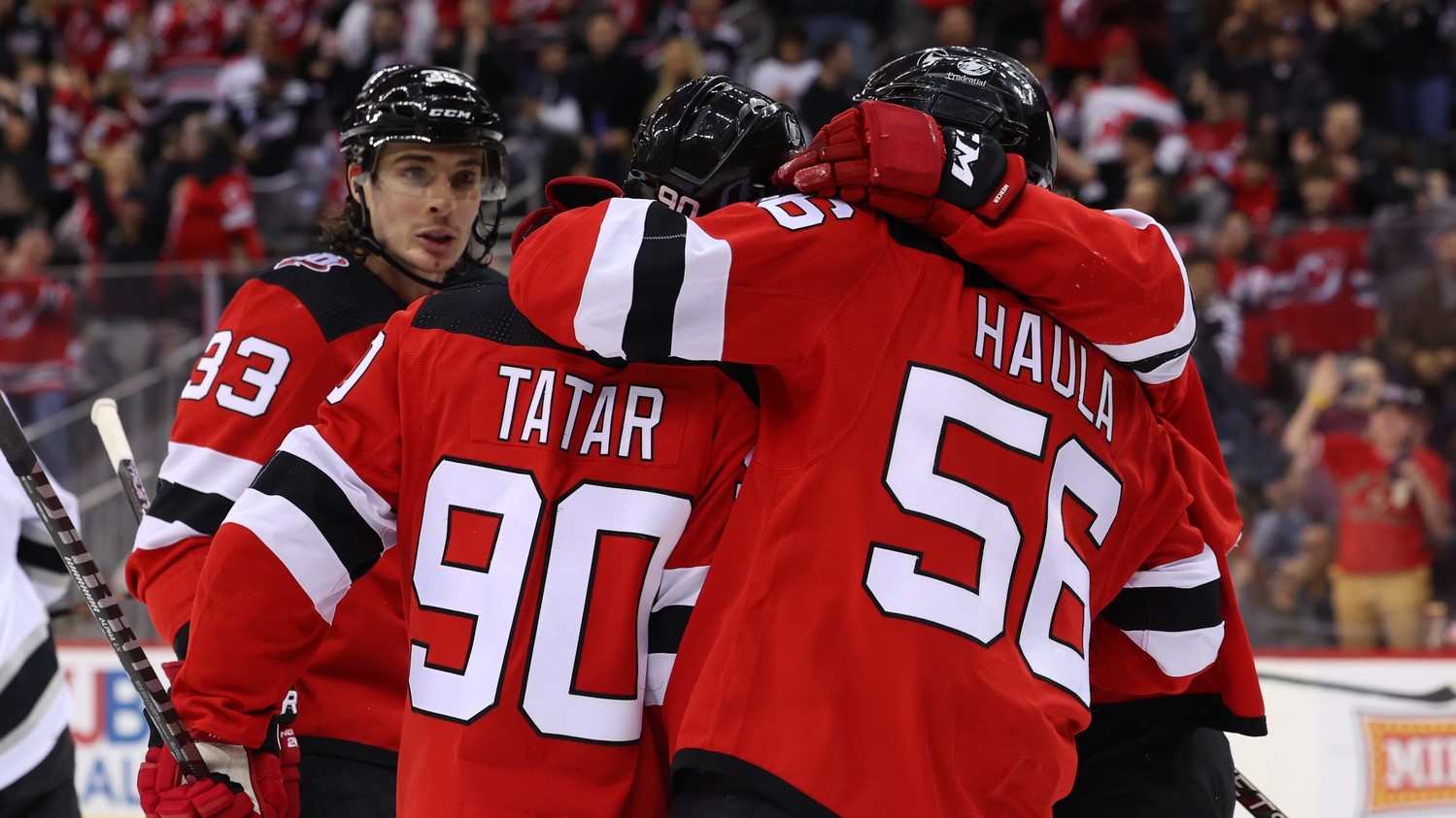 Feb 23, 2023; Newark, New Jersey, USA; New Jersey Devils left wing Tomas Tatar (90) celebrates his goal against the Los Angeles Kings during the second period at Prudential Center. / Ed Mulholland-USA TODAY Sports