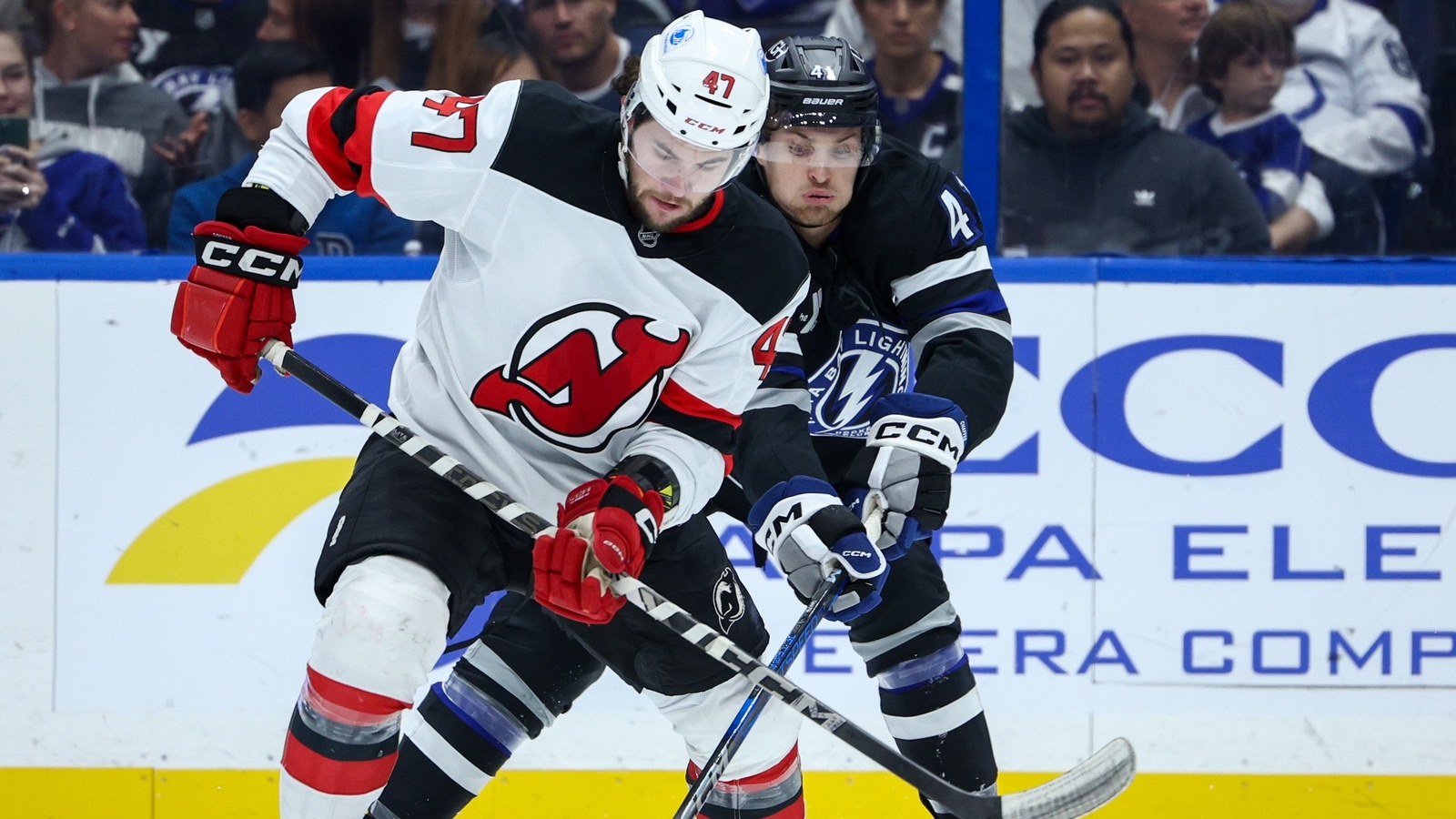 Devils give up three goals in third period in 4-0 shutout loss to LightningNew Jersey's two-game winning streak snapped11/17/2024, 3:20 AMAssociated PressNew Jersey Devils center Paul Cotter (47) controls the puck from Tampa Bay Lightning right wing Mitchell Chaffee (41) in the second period at Amalie Arena. / Nathan Ray Seebeck-Imagn Images