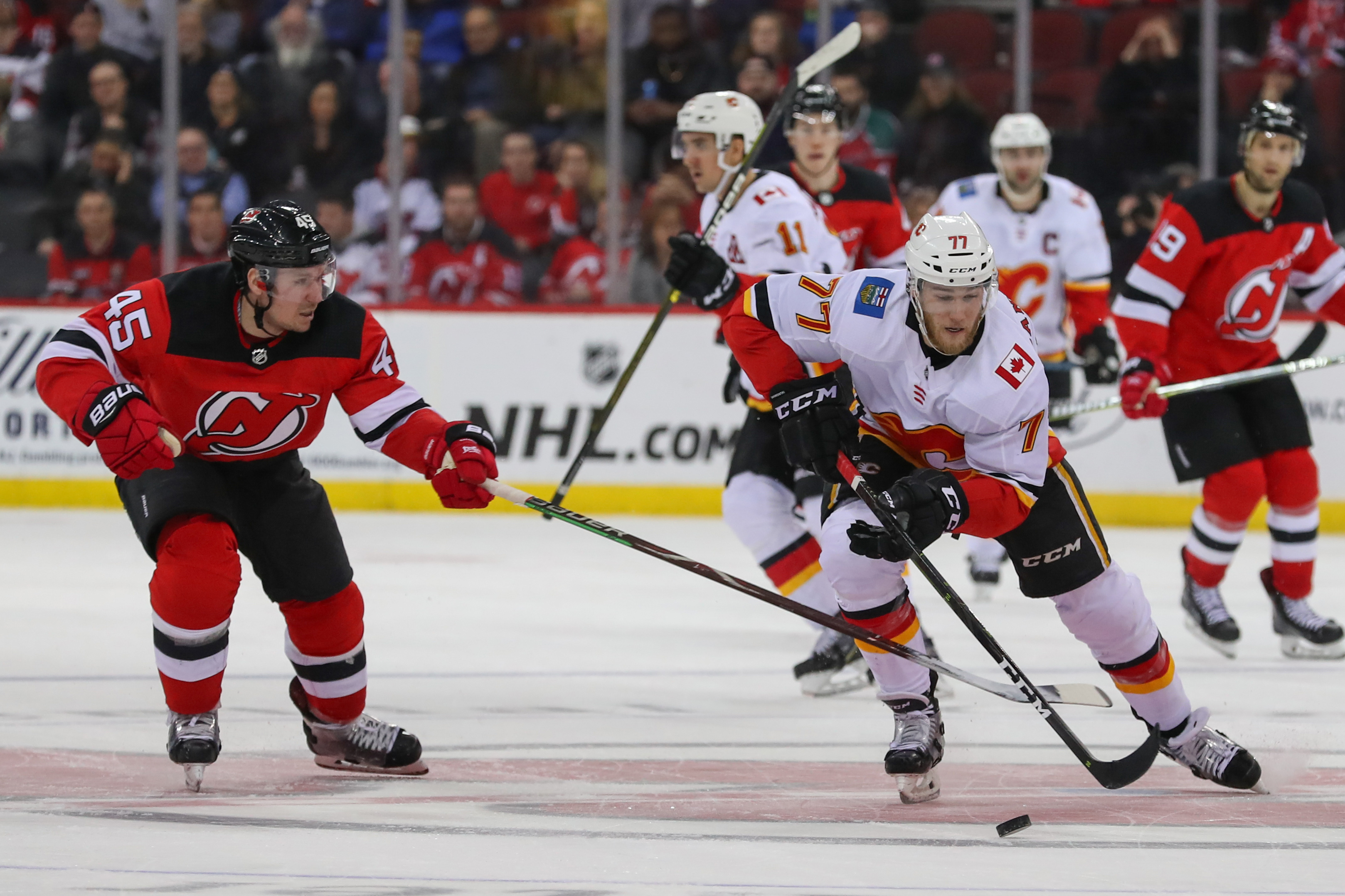 Feb 27, 2019; Newark, NJ, USA; Calgary Flames center Mark Jankowski (77) skates with the puck against New Jersey Devils defenseman Sami Vatanen (45) during the third period at Prudential Center. Mandatory Credit: Ed Mulholland-USA TODAY Sports / Ed Mulholland