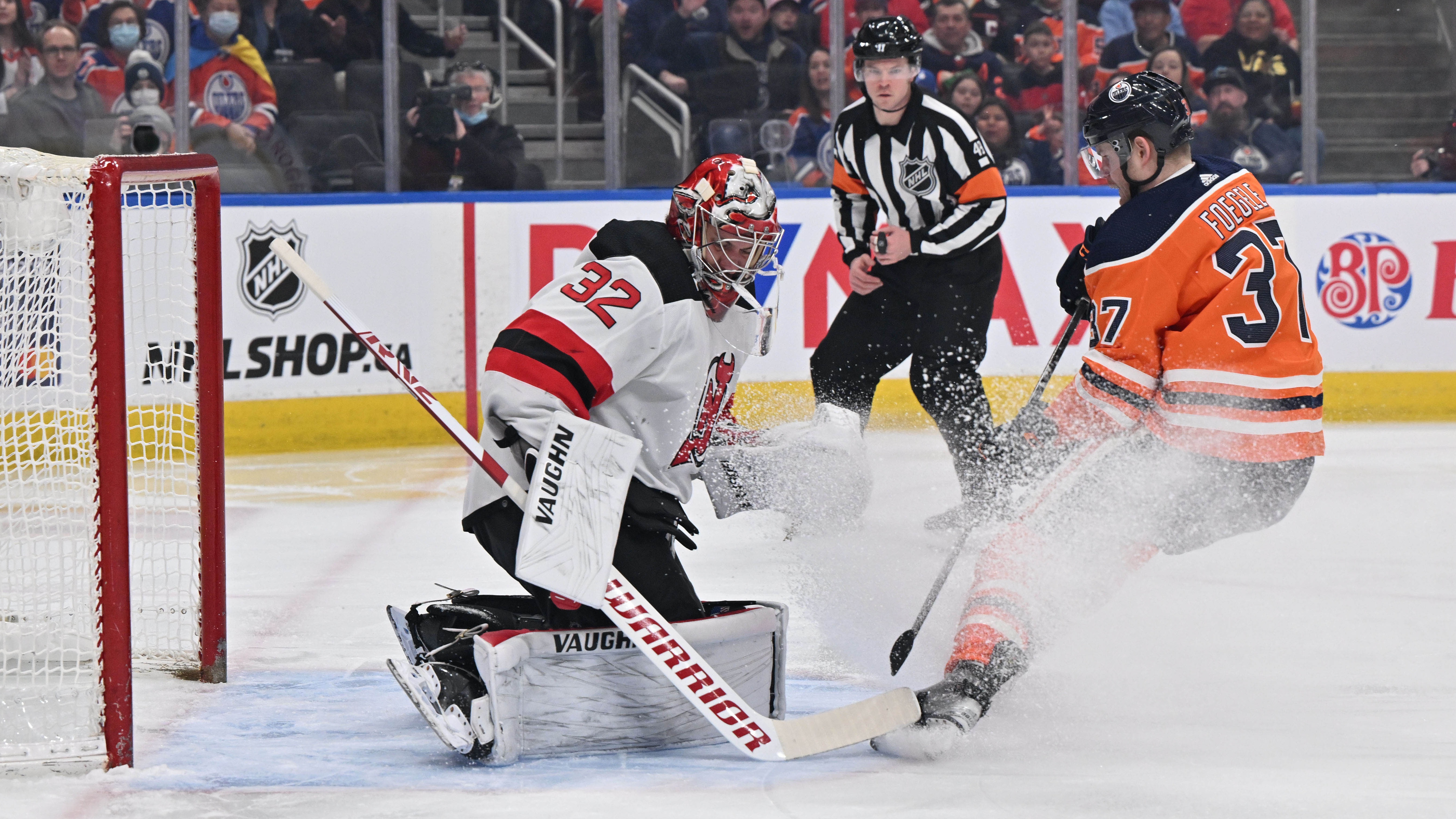 Devils losing streak extends to three with Saturday's 6-3 loss to OilersEdmonton's four-goal third period did New Jersey in3/19/2022, 10:43 PMMar 19, 2022; Edmonton, Alberta, CAN; New Jersey Devils goalie Jon Gillies (32) stops a shot from Edmonton Oilers left winger Warren Foegele (37) during the first period at Rogers Place. Mandatory Credit: Walter Tychnowicz-USA TODAY Sports / © Walter Tychnowicz-USA TODAY Sports