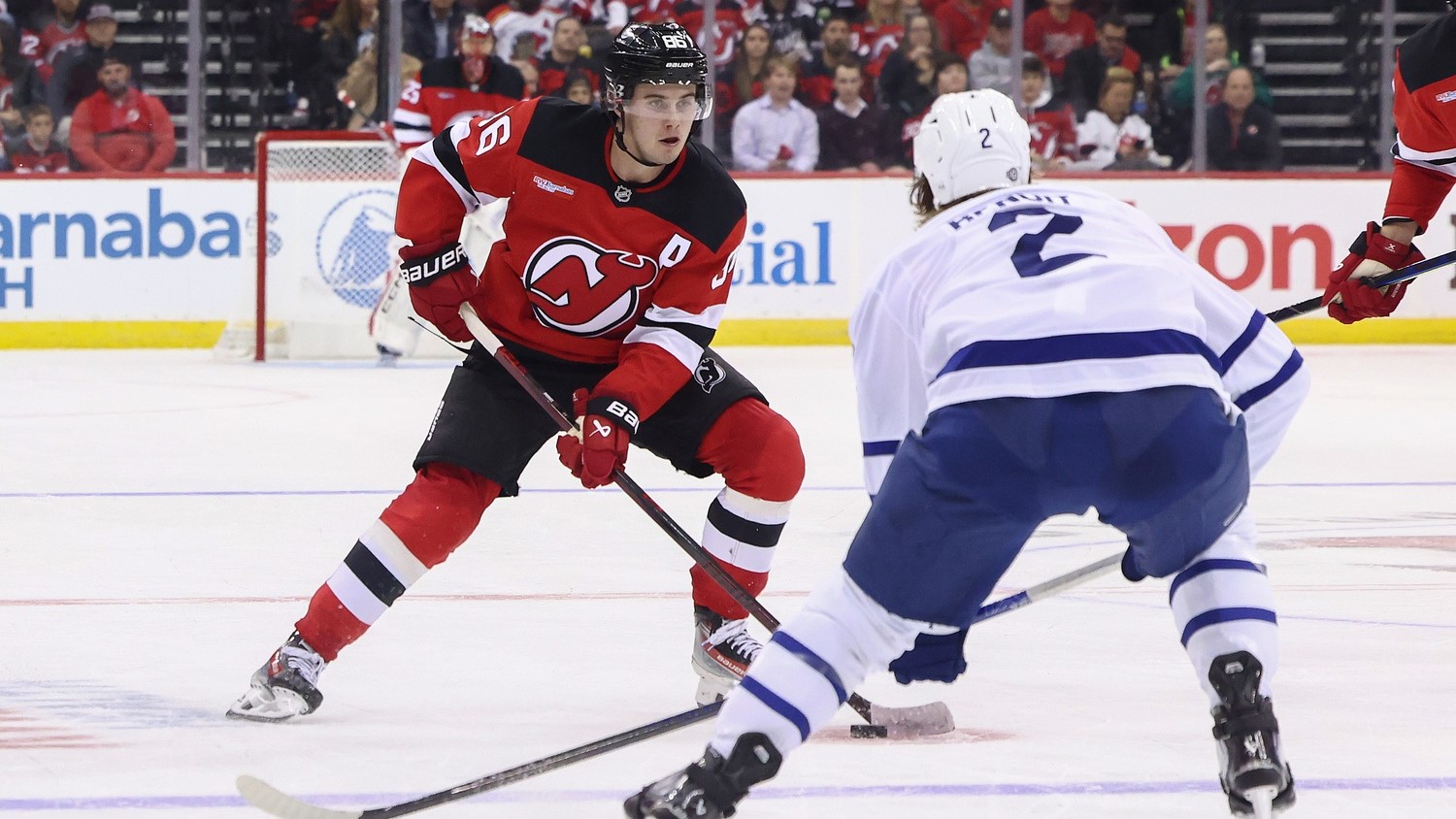 Devils allow three first-period goals in 4-2 loss to Maple LeafsJesper Bratt and Timo Meier scored Devils' only goals10/11/2024, 2:10 AMAssociated PressOct 10, 2024; Newark, New Jersey, USA; New Jersey Devils center Jack Hughes (86) skates with the puck while being defended by Toronto Maple Leafs defenseman Simon Benoit (2) during the second period at Prudential Center. / Ed Mulholland-Imagn Images