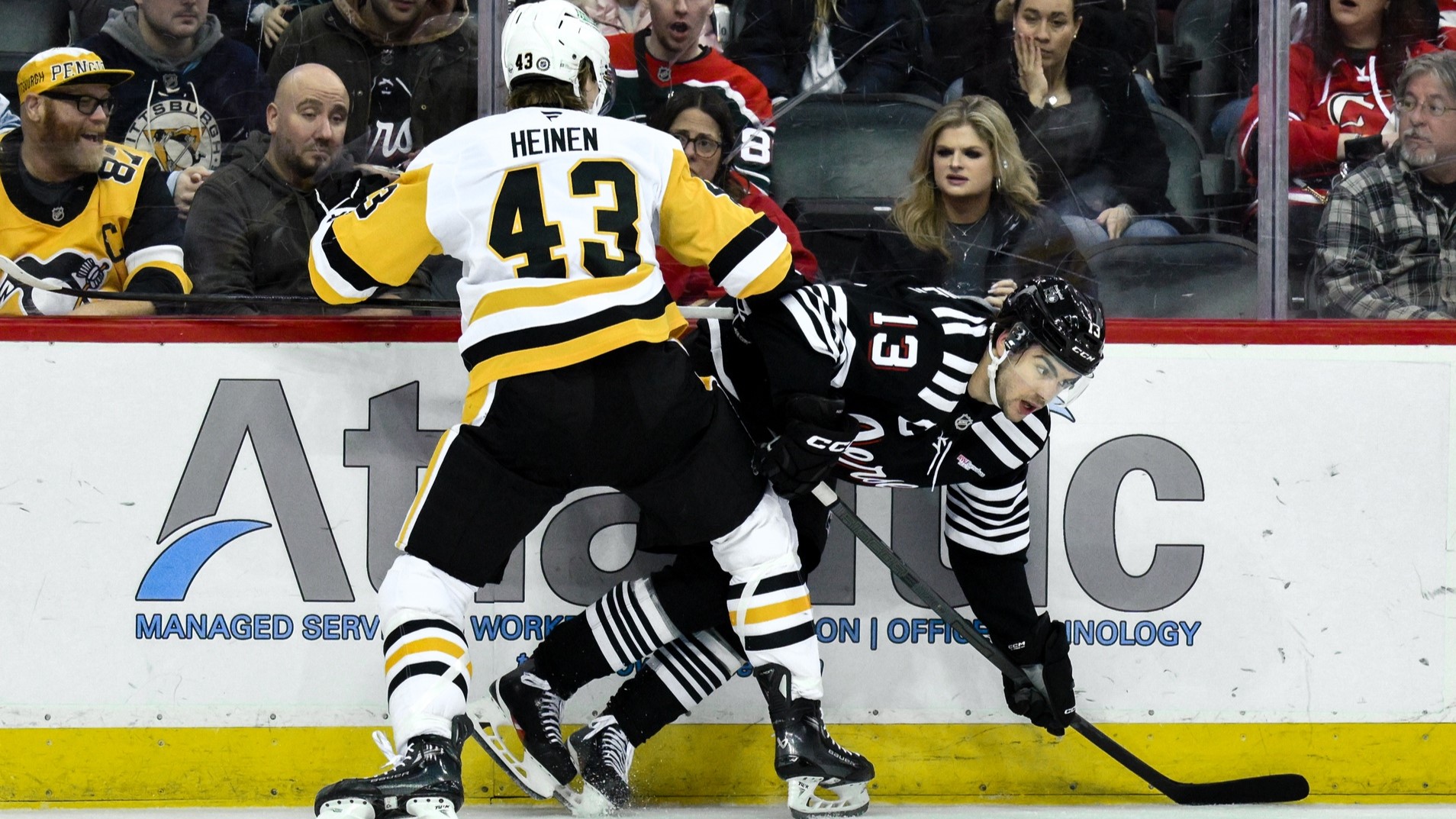 Devils allow four unanswered goals in 4-2 loss to PenguinsDevils scored twice in the first six minutes of game4/12/2025, 2:20 AMAssociated PressApr 11, 2025; Newark, New Jersey, USA; Pittsburgh Penguins left wing Danton Heinen (43) checks New Jersey Devils center Nico Hischier (13) during the second period at Prudential Center. / John Jones-Imagn Images