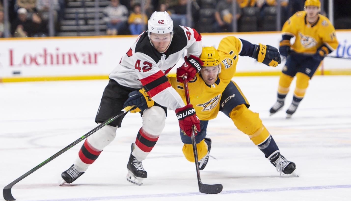 Devils pull out come-from-behind win over Predators, 4-2New Jersey scored three unanswered in third period to complete comeback2/14/2024, 4:11 AMAssociated PressNashville Predators left wing Mark Jankowski (17) and New Jersey Devils center Curtis Lazar (42) fight for the puck during the second period at Bridgestone Arena. / Steve Roberts-USA TODAY Sports
