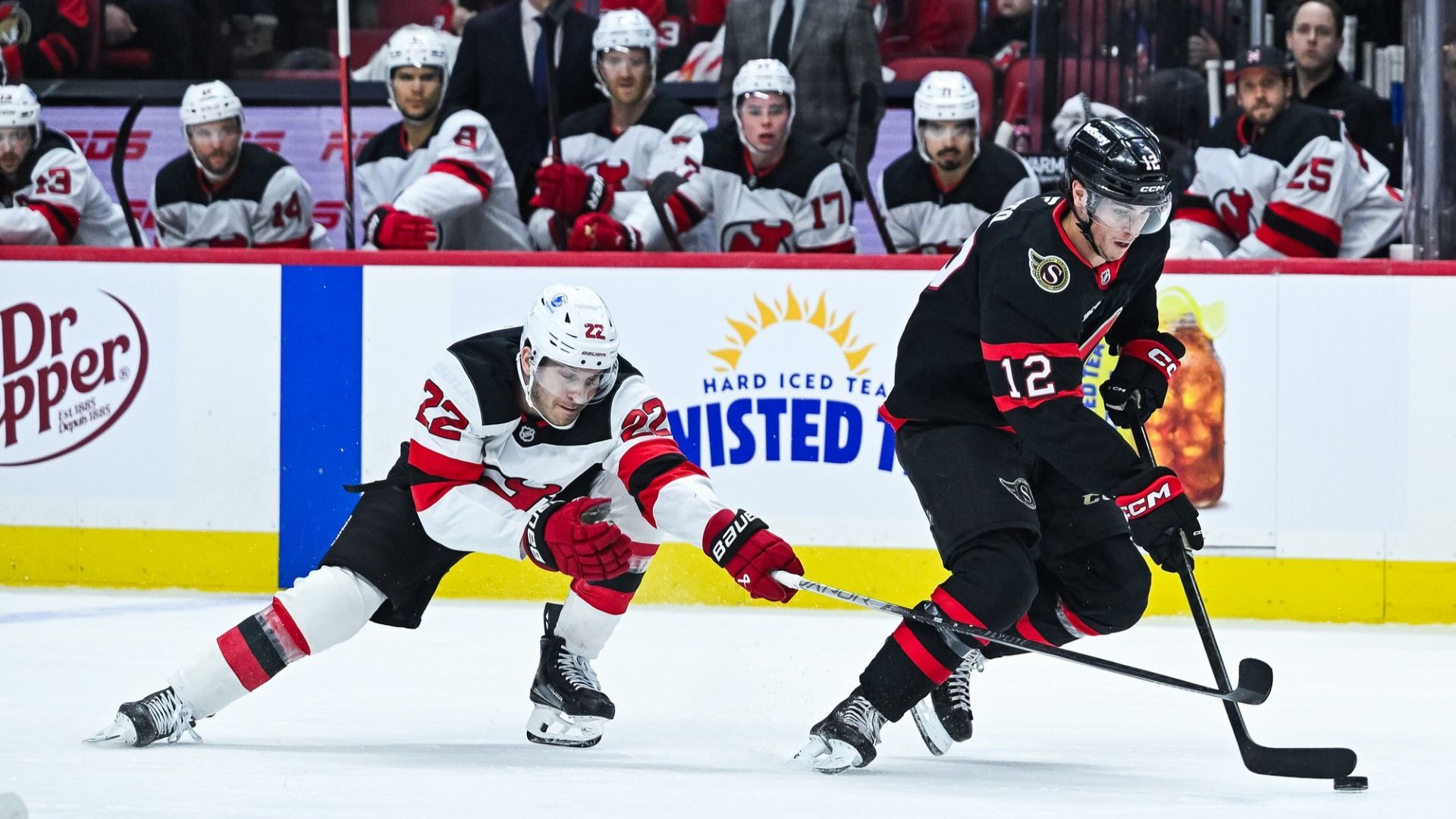Jan 31, 2026; Ottawa, Ontario, CAN; Ottawa Senators center Shane Pinto (12) plays the puck against New Jersey Devils defenseman Brett Pesce (22) during the first period at Canadian Tire Centre. Mandatory Credit: David Kirouac-Imagn Images / David Kirouac-Imagn Images